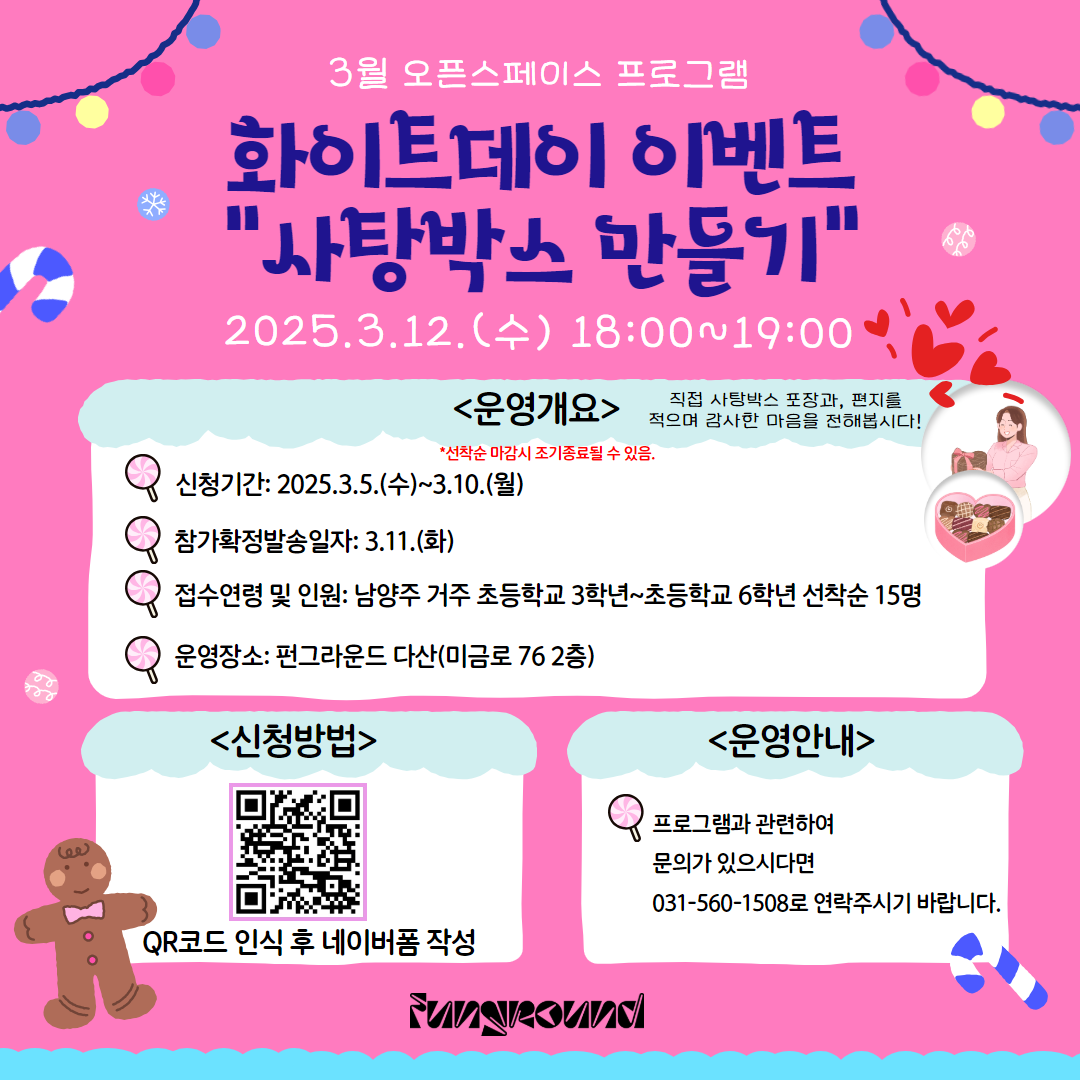 안녕하세요 펀그라운드 다산입니다! 3월 14일 화이트데이를 맞이하며, 펀그라운드 다산에서는 이벤트인 "사탕박스 만들기" 프로그램을 운영하고자 합니다. * 사탕박스 만들기 프로그램은, 사탕을 만들어서 먹는 프로그램이 아닌 사탕박스를 만들고, 사탕을 포장하고 편지를 써보는 활동을 할예정입니다. 꼭 신청하실 때 참고해주시기 바랍니다. <화이트 데이 이벤트> -운영일시: 2025.3.12.(수) 18:00~19:00 - 운영장소: 펀그라운드 다산 - 모집연령: "남양주 거주" 초등학교 3학년~초등학교 6학년 - 활동내용: 사탕박스 만들기 프로그램(사탕만들기 프로그램 아닙니다.) [신청방법] QR코드 혹은 신청링크로 들어가셔서 작성해주시면 됩니다. 선착순 접수입니다. 많은 관심 부탁드립니다! 문의사항) 031-560-1508 |
