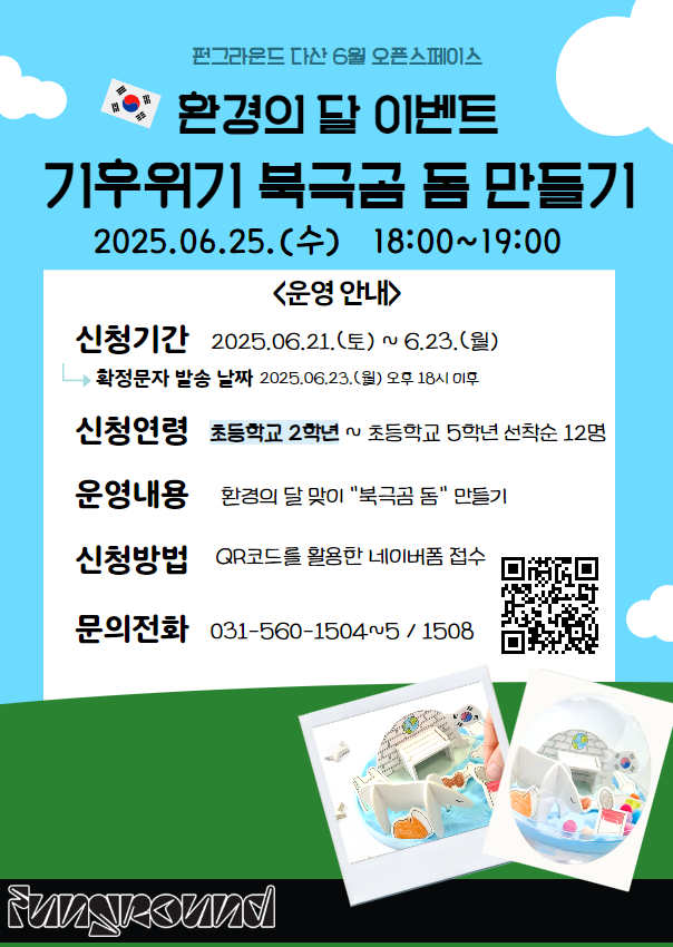 안녕하세요 펀그라운드 다산입니다. 6월 25일 수요일 환경의 달을 맞이하여 기후위기에 관해 직접 배워보고 생각하는 시간을 가지는 북극곰 돔 공예프로그램을 운영합니다. - 운영일시 : 2025.06.25.(수) 18:00~19:00 - 접수일정 : 2025.06.21(토)~06.23(월) *추가모집이므로 접수기간이 짧은점 양해 부탁드립니다. - 확정문자 발송일시: 2025.06.23.(월) 18시 이후 - 신청연령: 초등학교 2학년~초등학교 5학년 - 운영내용: 환경의 달 맞이 북극곰 돔 공예프로그램 - 신청방법: QR코드 접수 혹은 링크접속 문의전화 : 031-560-1508 감사합니다! |