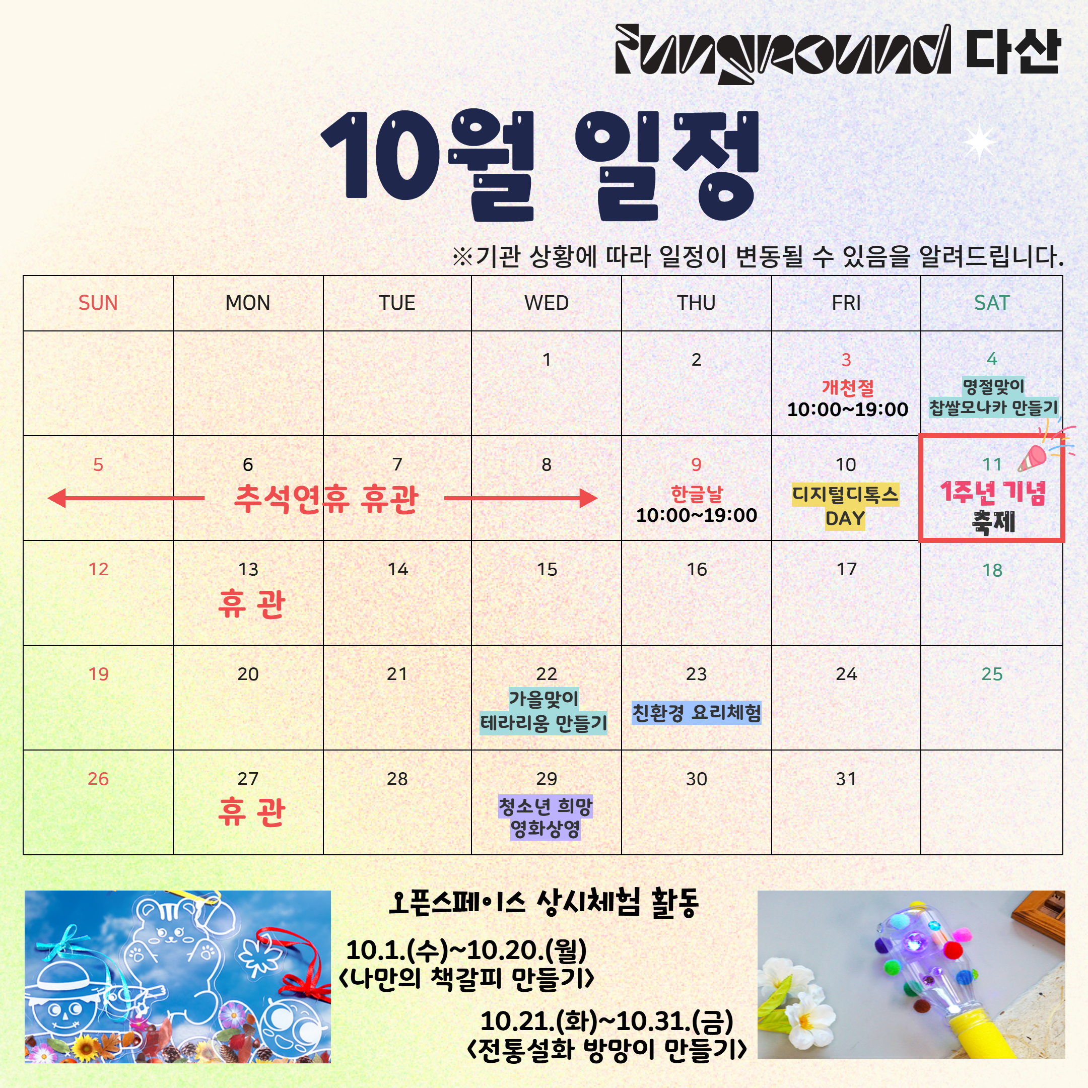 다산 [펀그라운드 다산] 10월 일정 안내 작성자 펀그라운드다산 등록일자 2025년 9월 30일 16시 18분 55초 조회 273 월 홍보 (1) (2).jpg [ Size : 5.66MB, Down : 340 ] 미리보기 다운로드 목록보기
