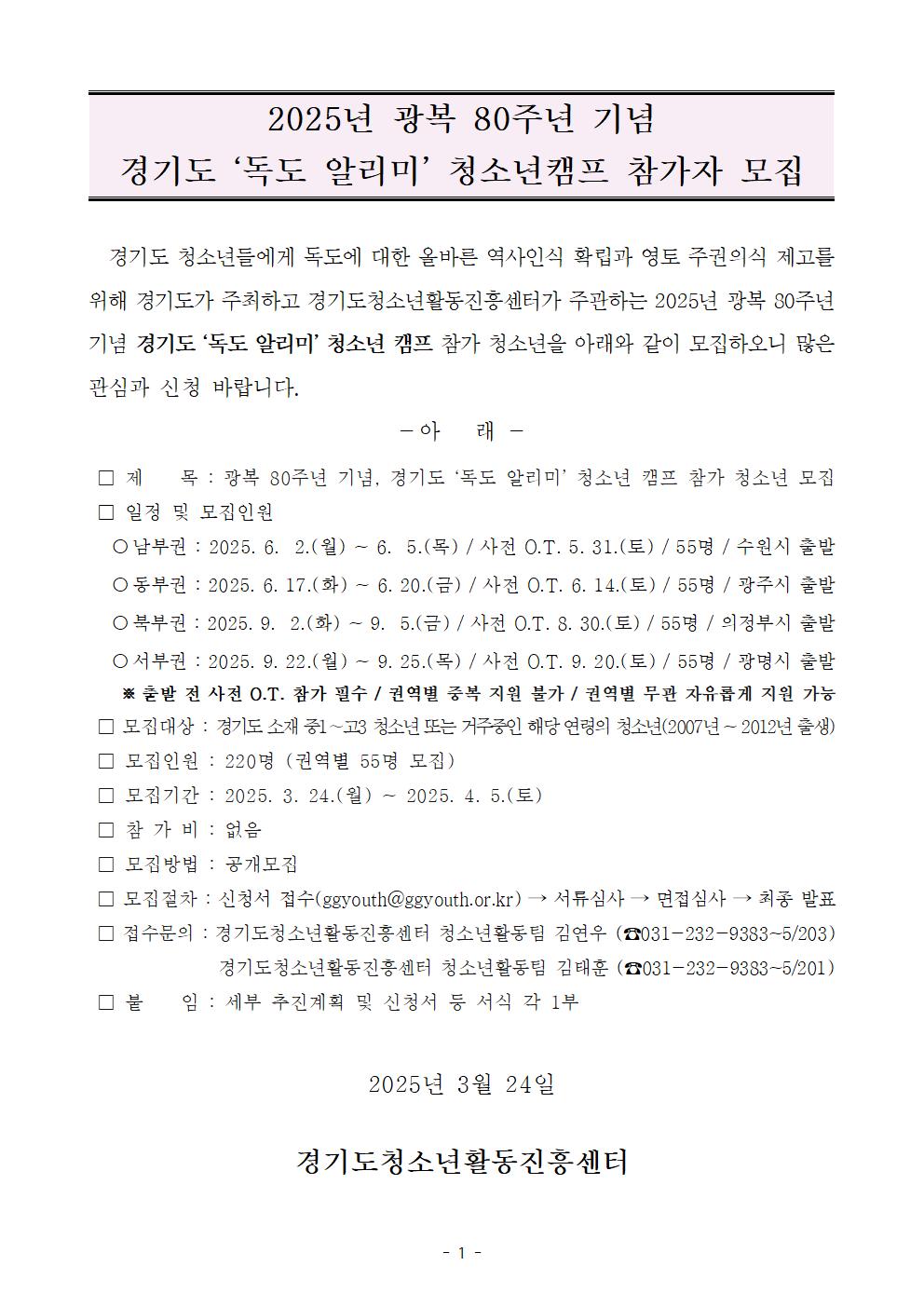 다산 2025년 광복 80주년 기념 경기도 [독도 알리미] 청소년캠프 참가자 모집 안내 작성자 펀그라운드다산 등록일자 2025년 4월 3일 17시 3분 48초 조회 227 3-21 경기도 독도 알리미 청소년캠프 모집 공고.pdf [ Size : 258.79KB, Down : 363 ] 다운로드 독도 알리미 모집001.jpg [ Size : 156.43KB, Down : 130 ] 미리보기 다운로드 목록보기