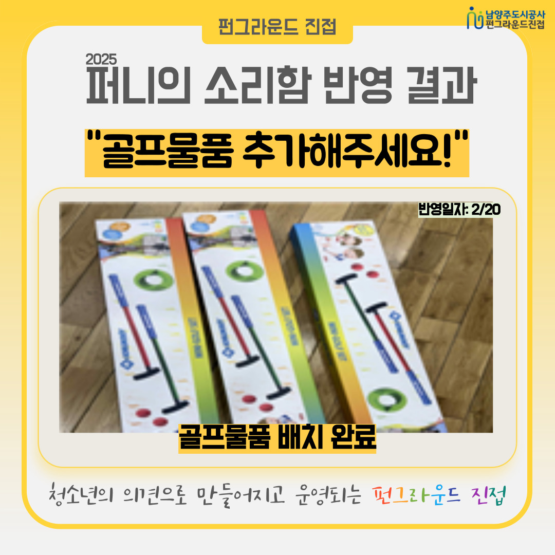 펀그라운드 진접을 이용하는 청소년들이 다양한 의견을 제시하고 공유할 수 있는 게시판입니다 (반영일: 2025.2.19.) 골프물품 배치 완료 작성자 펀그라운드진접 등록일자 2025년 7월 5일 18시 15분 57초 조회 59 011.jpg [ Size : 243.61KB, Down : 27 ] 미리보기 다운로드 답변하기 목록보기