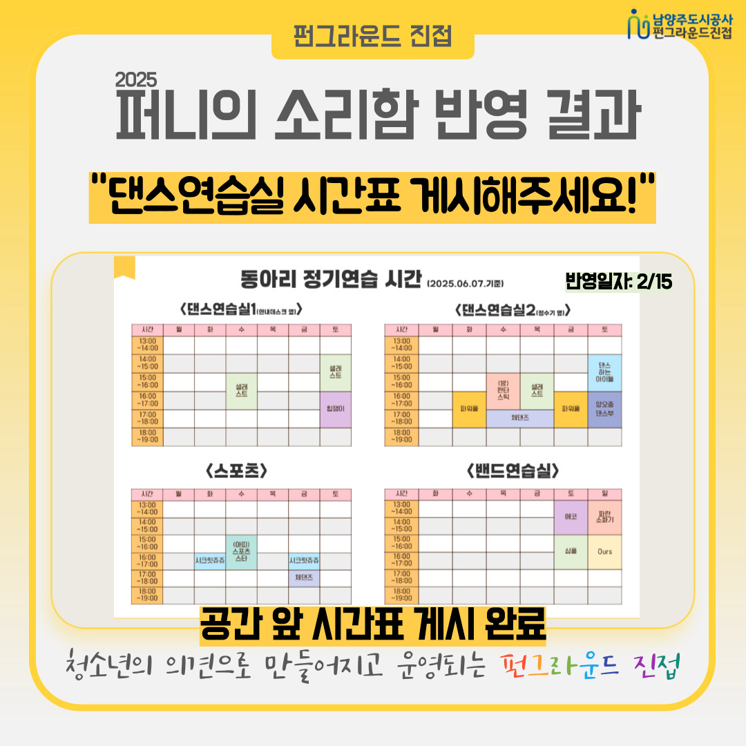펀그라운드 진접을 이용하는 청소년들이 다양한 의견을 제시하고 공유할 수 있는 게시판입니다 (반영일: 2025.2.15.) 공간 앞 시간표 게시 완료 작성자 펀그라운드진접 등록일자 2025년 7월 5일 18시 4분 2초 조회 63 005.jpg [ Size : 242.62KB, Down : 29 ] 미리보기 다운로드 답변하기 목록보기