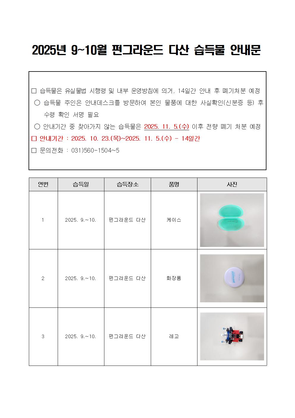 다산 2025년 9~10월 펀그라운드 다산 유실물 안내