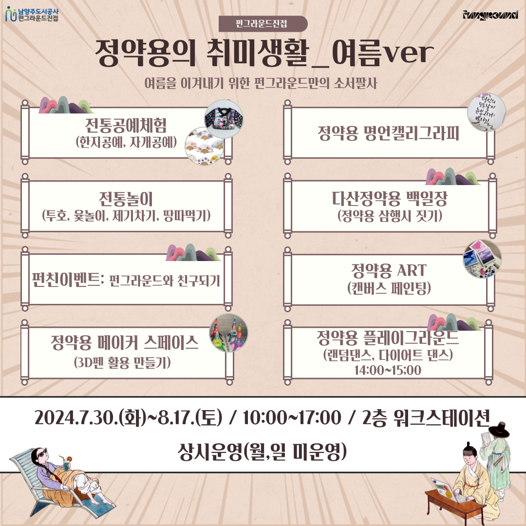 진접 [진접] 여름방학 프로그램 정약용취미생활_여름ver 안내 작성자 펀그라운드진접 등록일자 2024년 7월 26일 10시 35분 29초 조회 394 더운 여름 펀그라운드 진접에서 더위를 잊는 8가지 활동 함께 하는거 어떠니?방학내내 집에 있지말고 정약용 취미생활 함께하자 제목을-입력해주세요_-001.png [ Size : 1006.65KB, Down : 139 ] 미리보기 다운로드 목록보기