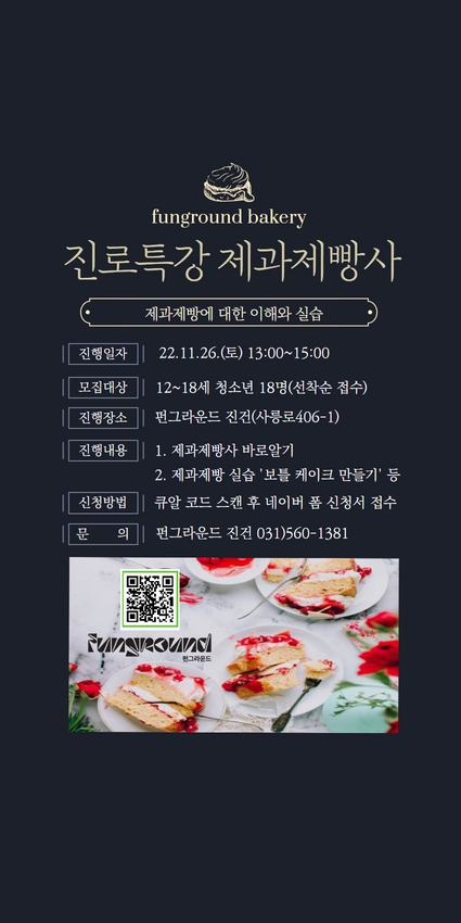 진건 펀그라운드 진건 진로특강 '제과제빵사' 참가자 모집 작성자 펀그라운드진건 등록일자 2022년 11월 19일 18시 22분 6초 조회 433 신청 방법: 링크 혹은 큐알코드 접속 후 온라인 신청서 접수 (선착순)신청 링크: https://naver.me/GA6K5Rd4 진로특강 제과제빵사 (2).jpg [ Size : 131.17KB, Down : 227 ] 미리보기 다운로드 목록보기