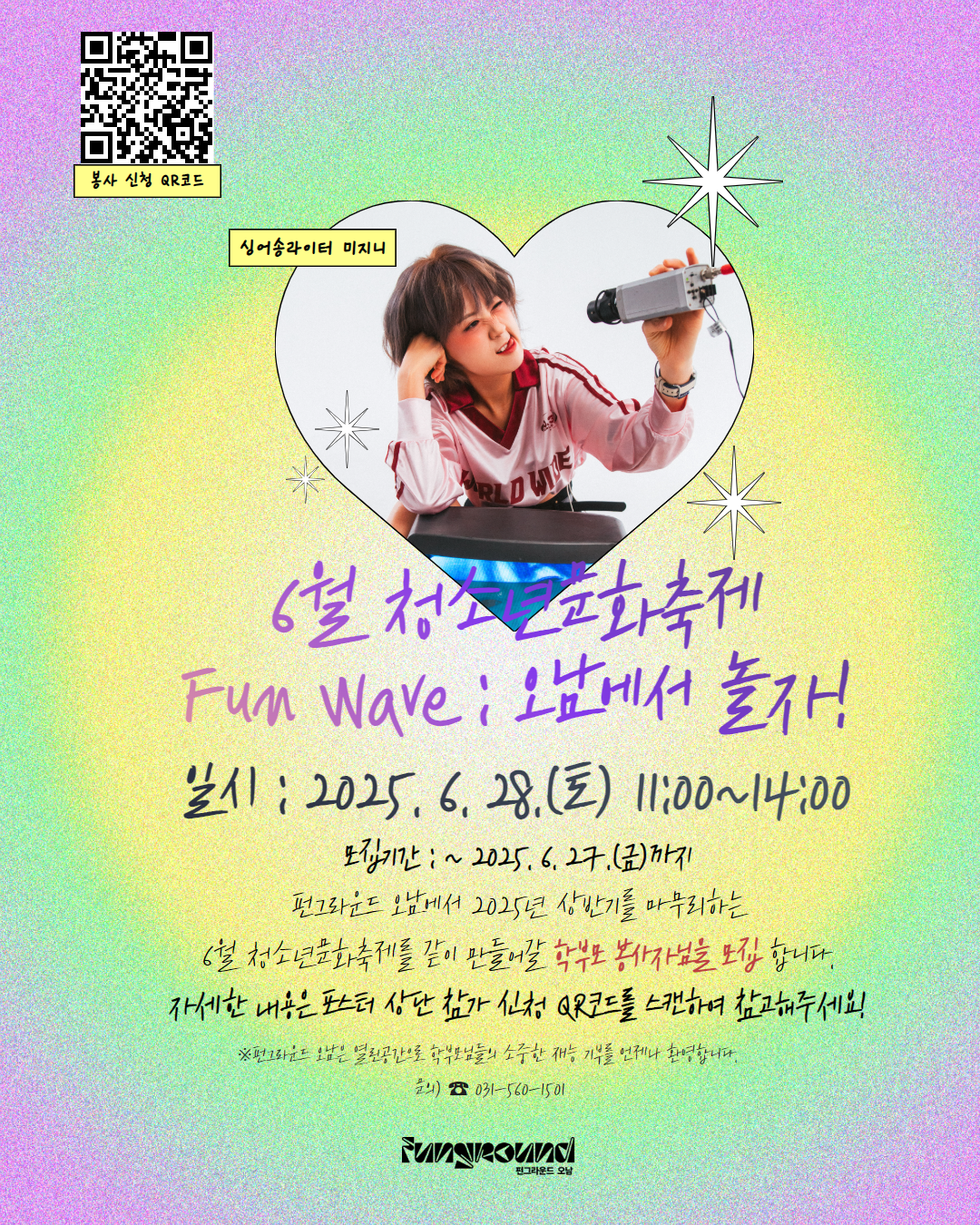 오남 [펀그라운드 오남] 6월 청소년문화축제 학부모 봉사자 모집 안내 작성자 펀그라운드오남 등록일자 2025년 6월 24일 10시 22분 10초 조회 131 봉사신청 : https://naver.me/50JkGHwH 6월 청소년문화축제 봉사자 모집_최종.png [ Size : 3.96MB, Down : 80 ] 미리보기 다운로드 목록보기