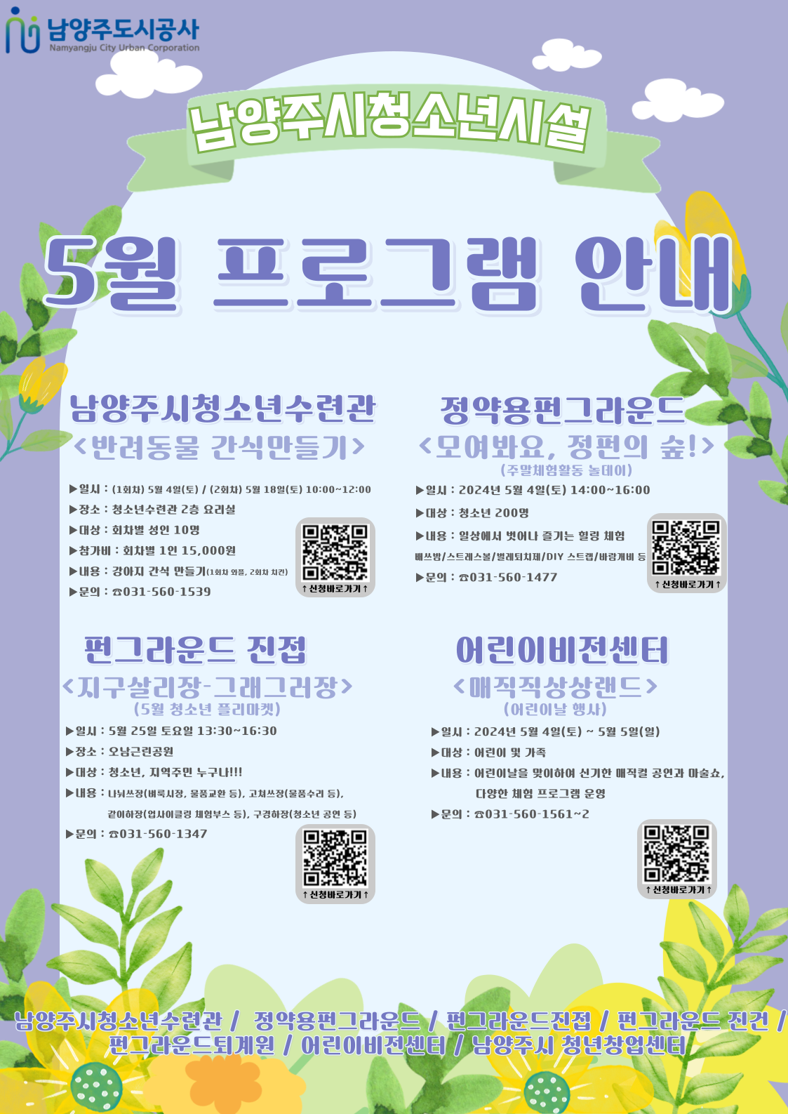 남양주시청소년수련관·정약용 펀그라운드·펀그라운드 진접·펀그라운드 진건·펀그라운드 퇴계원·남양주시 청년창업센터가 연합하여 "남양주시 청소년시설 5월 프로그램"을 안내합니다!!