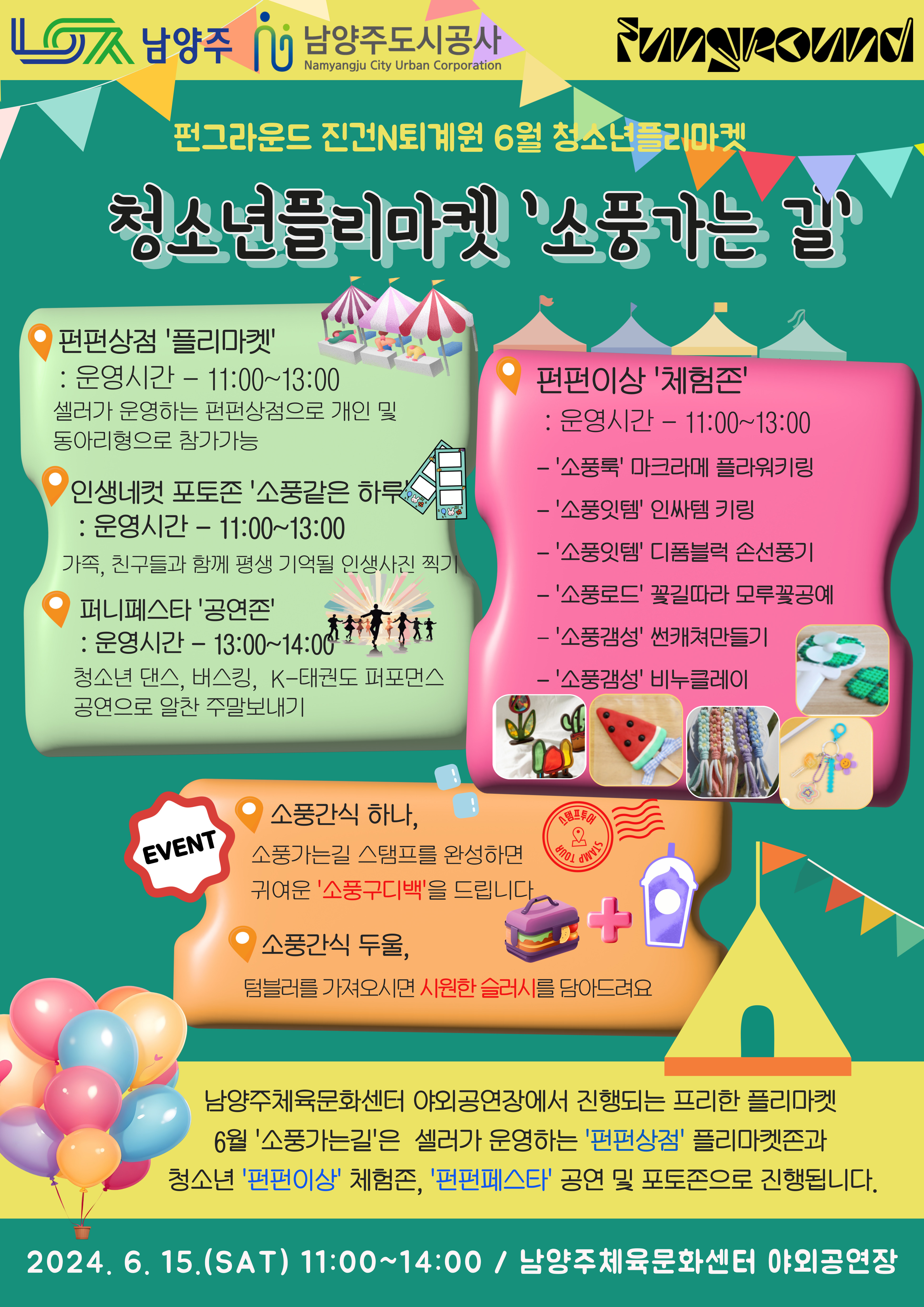청소년체험부스, 공연, 포토존, 셀러까지 ! 다양한 이벤트가 준비되어있으니 6월 15일에 남양주체육문화센터에서 만나요!