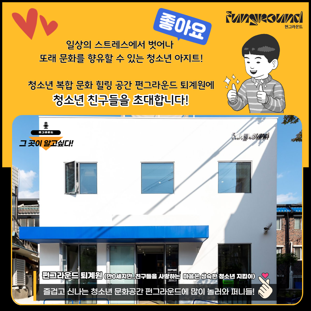 퇴계원 청소년 복합문화공간 펀그라운드 퇴계원! <그곳이 알고싶다 편> 작성자 펀그라운드 퇴계원 등록일자 2022년 9월 7일 15시 48분 10초 조회 355 003.jpg [ Size : 456KB, Down : 158 ] 미리보기 다운로드 004.jpg [ Size : 808.45KB, Down : 202 ] 미리보기 다운로드 002.jpg [ Size : 963.11KB, Down : 158 ] 미리보기 다운로드 001.jpg [ Size : 820.87KB, Down : 161 ] 미리보기 다운로드 005.jpg [ Size : 732.21KB, Down : 183 ] 미리보기 다운로드 목록보기