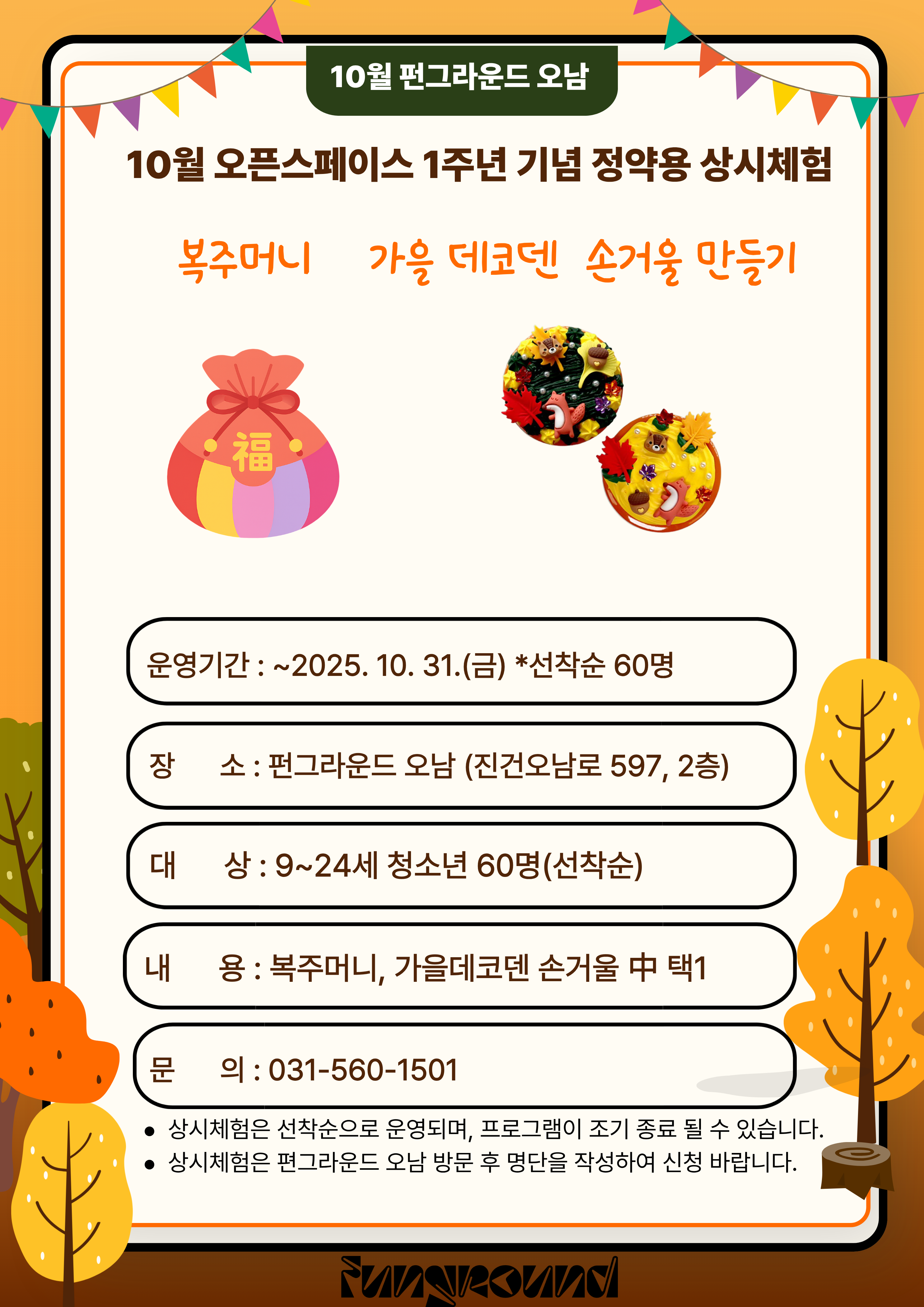 오남 [펀그라운드 오남] 10월 오픈스페이스 상시체험(가을데코덴 손거울, 복주머니) 운영 안내 작성자 펀그라운드오남 등록일자 2025년 10월 3일 0시 26분 44초 조회 111 10월 상시체험_1001.png [ Size : 2.17MB, Down : 61 ] 미리보기 다운로드 목록보기