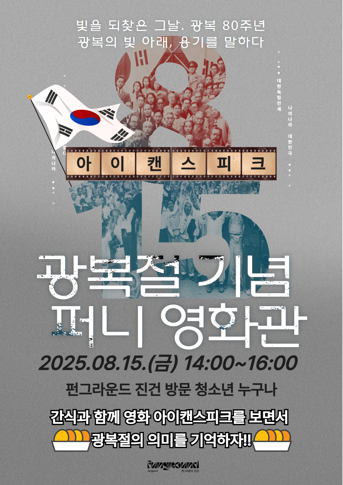 진건 [펀그라운드 진건] 광복절기념 퍼니 영화관 작성자 펀그라운드진건 등록일자 2025년 8월 13일 19시 41분 1초 조회 147 광복절 기념 퍼니 영화관 빛을 되찾은 그날의 감동을 함께 나누는 시간! 광복 80주년을 맞아, 영화 〈아이 캔 스피크〉 상영회를 준비했습니다.일시: 2025년 8월 15일(금) 14:00~16:00장소: 펀그라운드 진건대상: 펀그라운드 진건 방문 청소년 누구나내용: 간식과 함께 영화 〈아이 캔 스피크〉 감상하며 광복절의 의미 되새기기문의: 031-560-1389 퍼니 영화관.jpg [ Size : 1.66MB, Down : 55 ] 미리보기 다운로드 목록보기