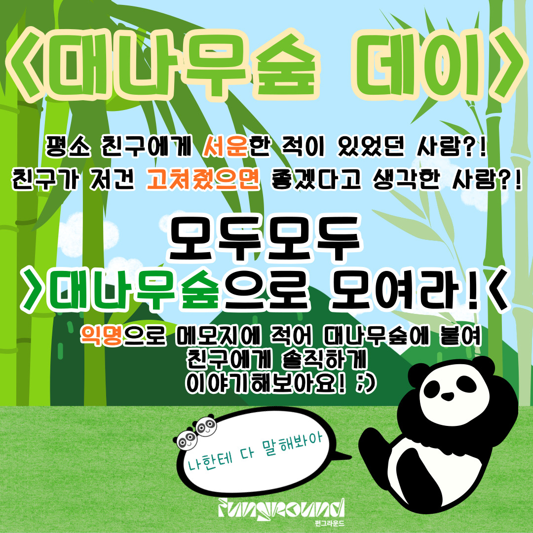 안녕! 9월 13일에 내 숲속으로 놀러오지 않을래? 대나무숲에서 내가 너희 이야기를 다 들어줄게. 친구들에게 속상했던 일, 서운했던 일, 고쳐줬으면 좋겠는 점을 나한테 이야기해줘.