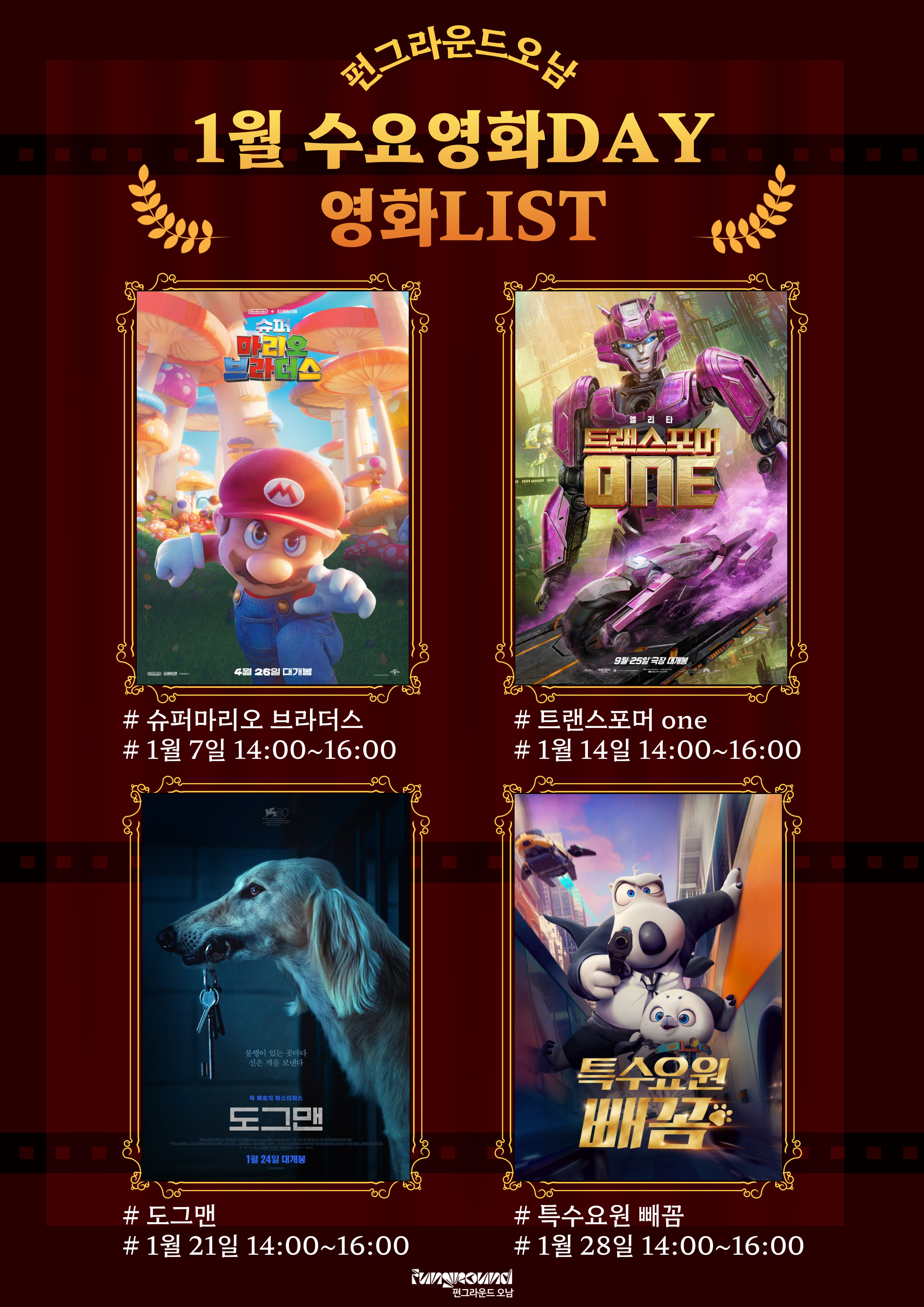 공지 오남 [펀그라운드 오남] 1월 수요영화 LIST 작성자 펀그라운드진건 등록일자 2026년 1월 2일 12시 26분 56초 조회 26 수요영화-양식1월 영화 수정-001.jpg [ Size : 1.59MB, Down : 6 ] 미리보기 다운로드 목록보기