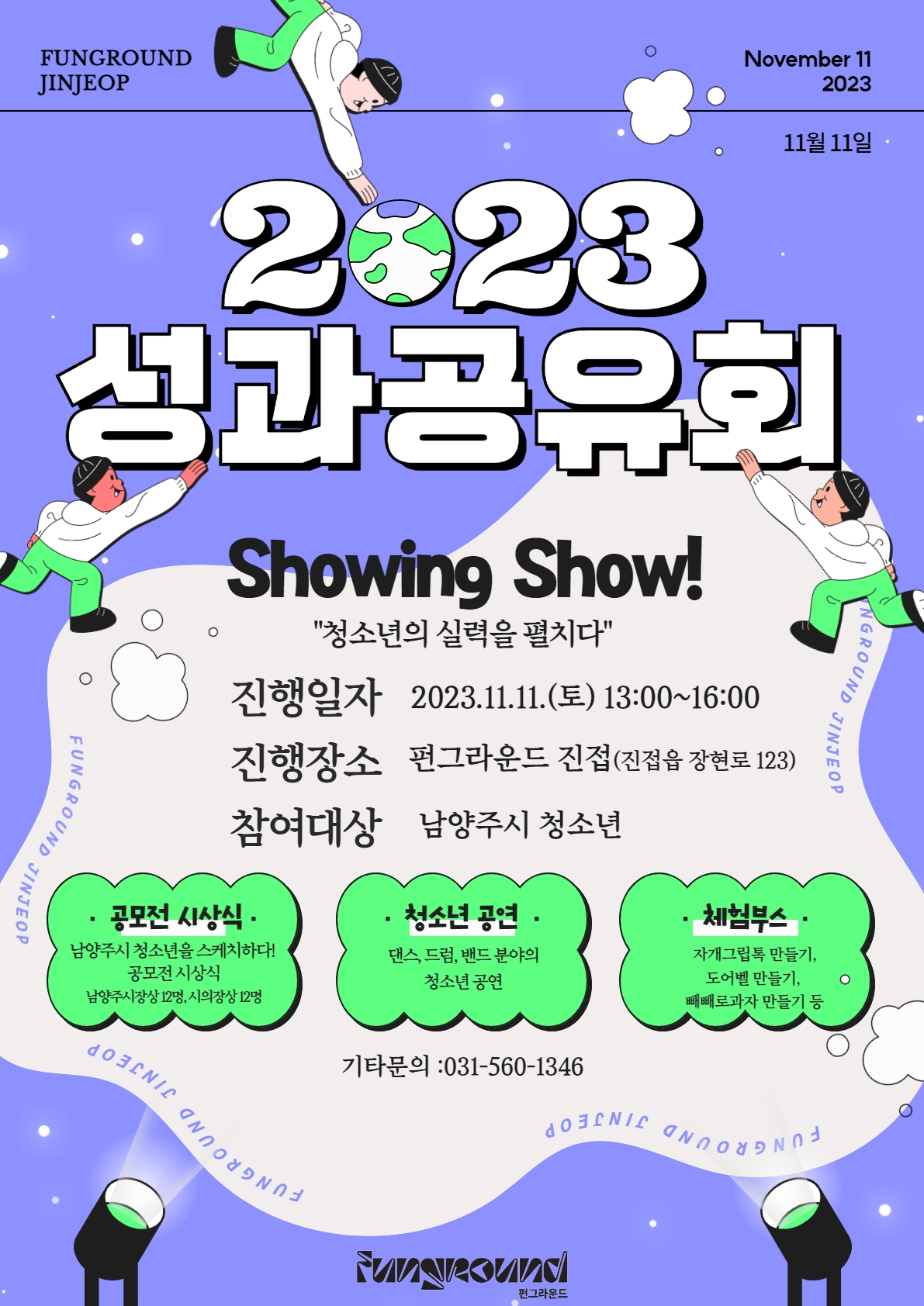 진접 2023 성과공유회 & 공모전 시상식 안내 작성자 펀그라운드진접 등록일자 2023년 11월 9일 9시 57분 3초 조회 409 안녕하세요 펀그라운드 진접입니다.이번주 토요일인 11월 11일 13:00~16:00까지 펀그라운드 성과공유회가 진행됩니다.13시부터 개회식과 공모전 시상식 및 청소년들의 공연이 진행되며14:00~16:00에는 다양한 체험부스가 진행됩니다.많은 참여 부탁드립니당~ 성과공유회(포스터).jpg [ Size : 627.97KB, Down : 863 ] 미리보기 다운로드 목록보기