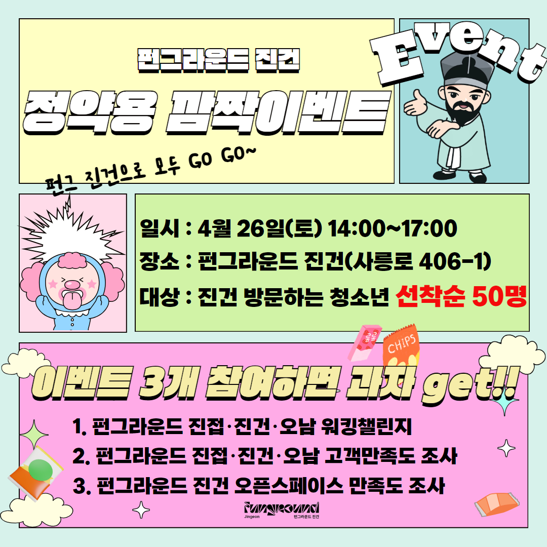 진건 [펀그라운드 진건] 정약용 깜짝이벤트 *현장접수* 작성자 펀그라운드진건 등록일자 2025년 4월 24일 11시 24분 20초 조회 209 안녕하세요 펀그라운드 진건입니다~~펀그라운드 진건에서 간단한 이벤트만 참여해도 과자가 팡팡!!!4월 26일 펀그라운드 진건을 방문하는 청소년 선착순 50명에게간단한 3가지 이벤트 진행 후 과자를 제공하고 있으니주말에 펀그라운드 진건에 와서 맛있는 과자먹고 가세요 정약용 깜짝이벤트(4.26..jpg [ Size : 723.91KB, Down : 75 ] 미리보기 다운로드 목록보기