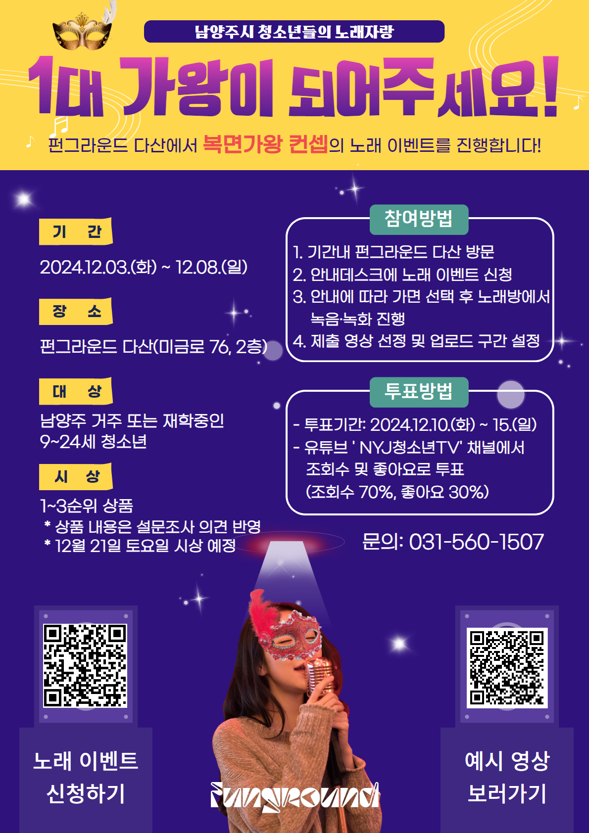 다산 [펀그라운드 다산] 12월 복명가왕 노래 이벤트 안내 작성자 펀그라운드다산 등록일자 2024년 11월 28일 13시 28분 37초 조회 345 복면가왕 노래 이벤트 .jpg [ Size : 1.09MB, Down : 260 ] 미리보기 다운로드 목록보기