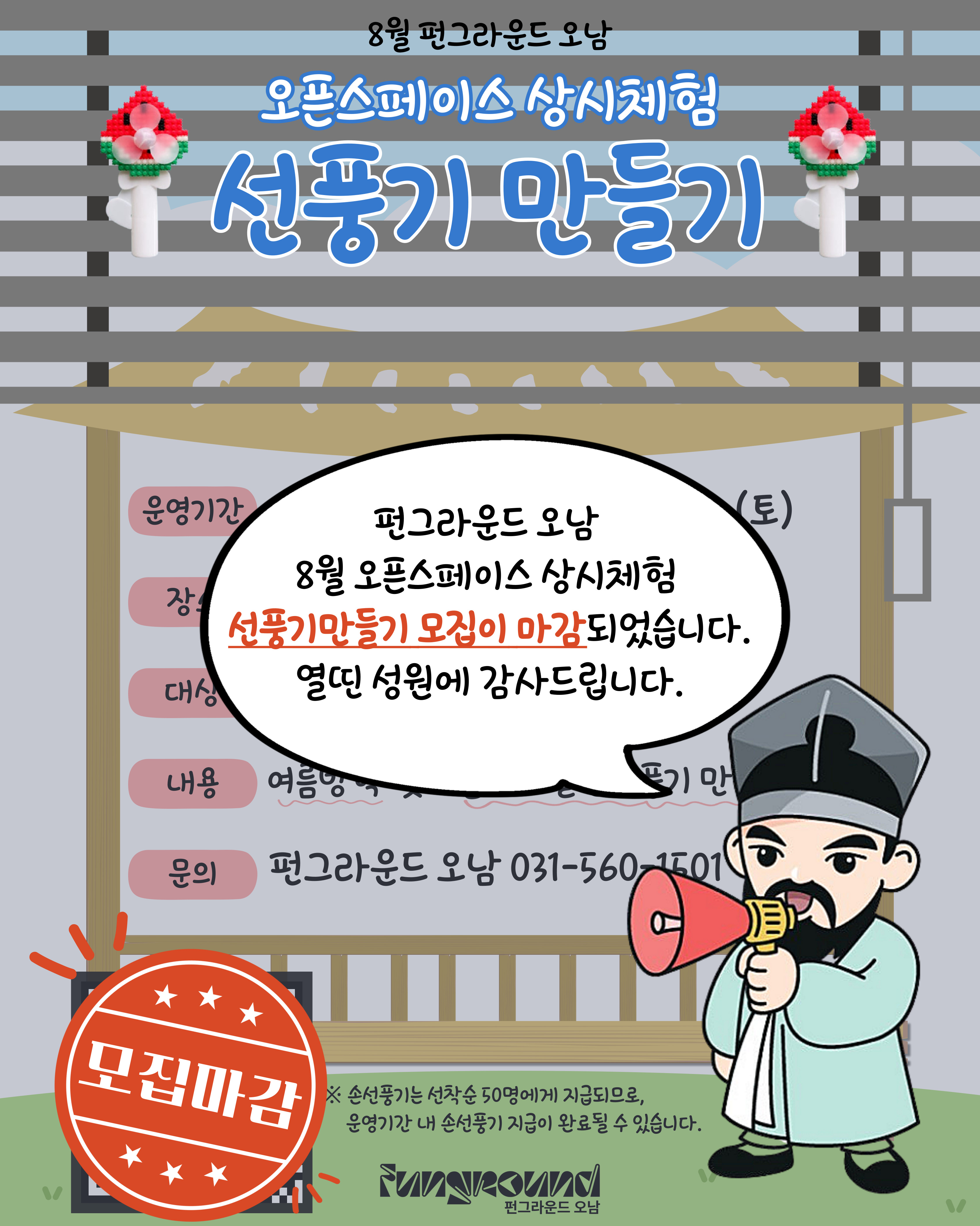 오남 [펀그라운드 오남] 8월 오픈스페이스 상시체험 <선풍기만들기> 모집 마감 안내 작성자 펀그라운드오남 등록일자 2025년 8월 12일 16시 53분 26초 조회 120 안녕하세요. 펀그라운드 오남입니다.8월 오픈스페이스 상시체험 <선풍기만들기> 모집이 마감되었습니다.열띤 성원에 진심으로 감사드리며, 더 Fun한 체험으로 돌아오겠습니다.다음 체험에서 만나요 ❤️ 선풍기 상시체험 마감 포스터.jpg [ Size : 1.54MB, Down : 51 ] 미리보기 다운로드 목록보기