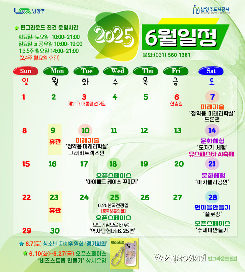 공지 청소년자치위원회 [펀그라운드 진건] 6월일정 공지 작성자 펀그라운드진건 등록일자 2025년 5월 27일 10시 21분 4초 조회 170 6월일정_sns.jpg [ Size : 154.63KB, Down : 78 ] 미리보기 다운로드 목록보기