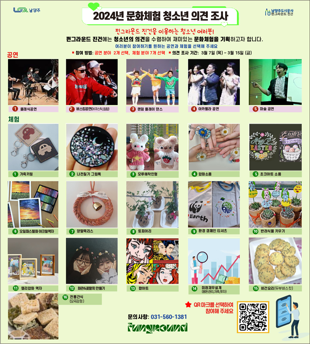 진건 [펀그라운드 진건] 2024년 문화체험 청소년 의견 조사 작성자 펀그라운드진건 등록일자 2024년 3월 9일 15시 51분 49초 조회 278 문화체험 청소년 의견조사 바로가기 2024-문화체험_sns.jpg [ Size : 898.84KB, Down : 151 ] 미리보기 다운로드 목록보기