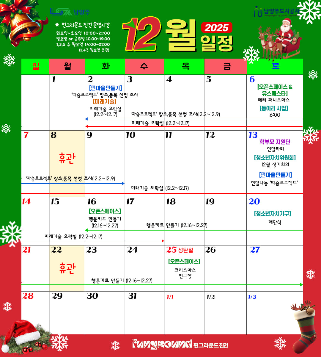 공지 진건 [펀그라운드 진건] 12월 일정을 공지합니다 작성자 펀그라운드진건 등록일자 2025년 11월 29일 12시 13분 28초 조회 56 2025-12_sns.jpg [ Size : 214.05KB, Down : 56 ] 미리보기 다운로드 목록보기