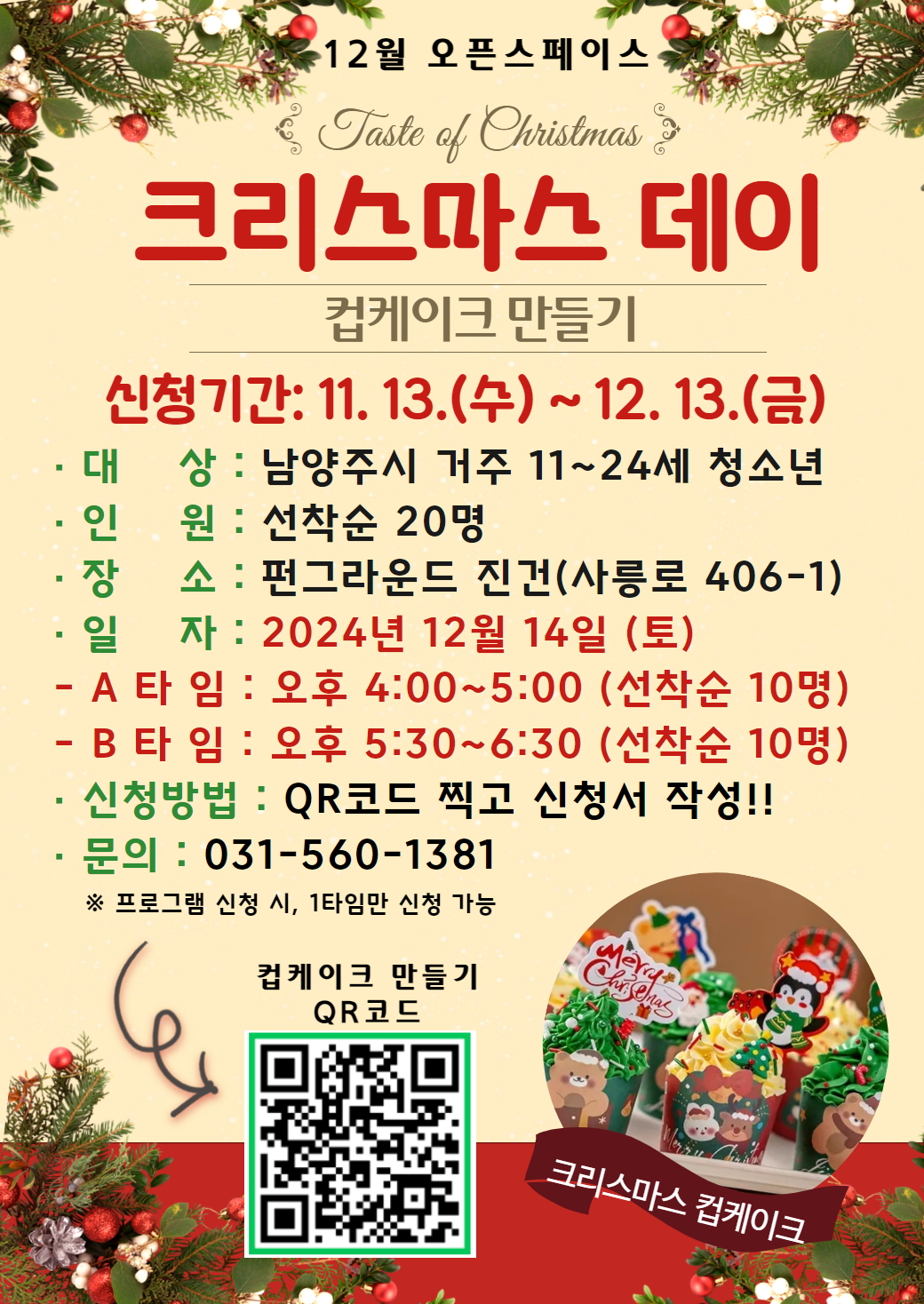 진건 12월 오픈스페이스 크리스마스 데이 '컵케이크 만들기' 사전 신청자 모집 작성자 개발자 등록일자 2024년 11월 13일 14시 35분 32초 조회 345 곧!! 크리스마스 두둥!! 펀그라운드 진건에 와서 컵케이크 만들자!!어서 드루와~!!!12월 오픈스페이스 크리스마스 데이'컵케이크 만들기' 12월 포스터.jpg [ Size : 1.26MB, Down : 127 ] 미리보기 다운로드 목록보기