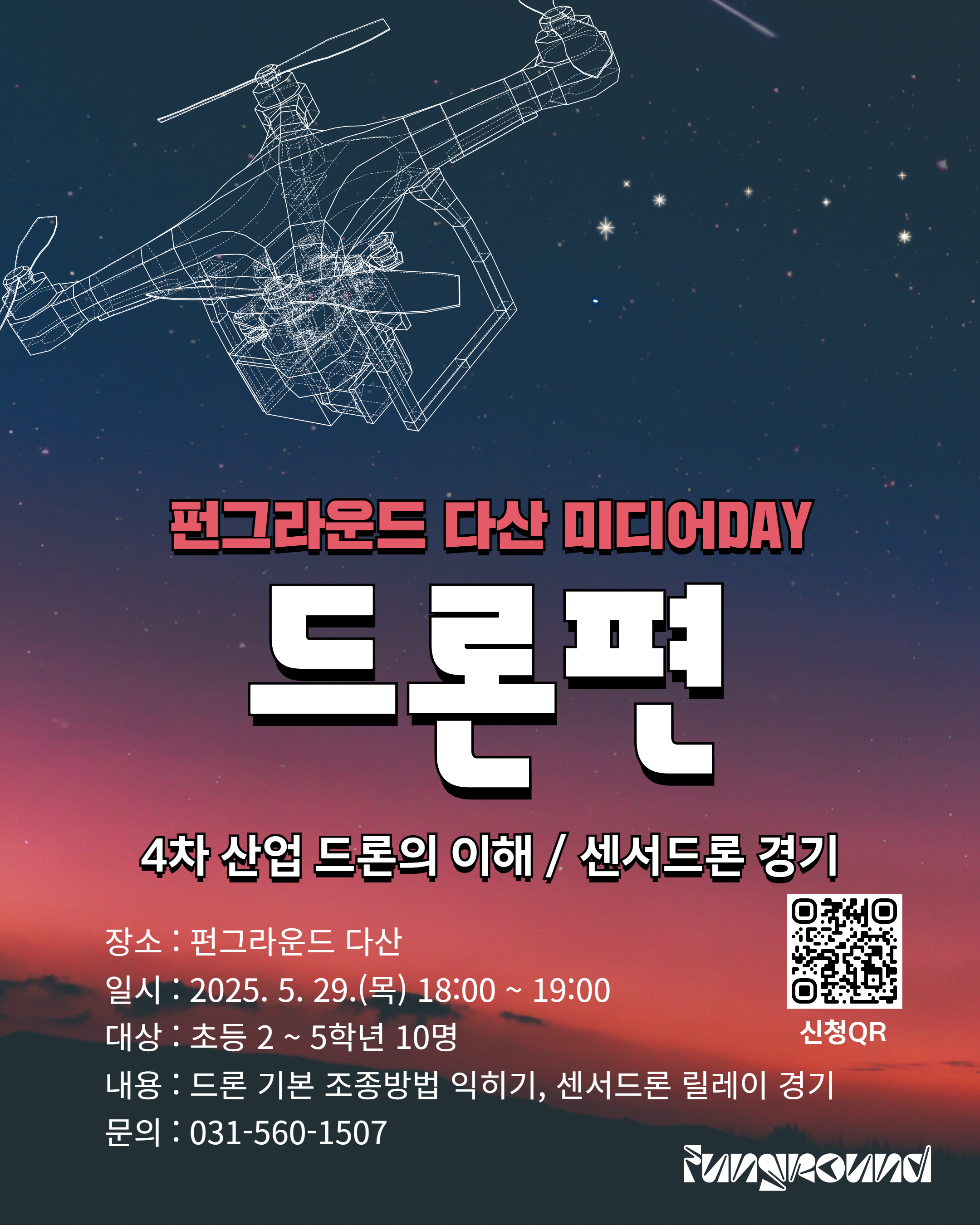 다산 [펀그라운드 다산] 5월 디지털스튜디오 미디어DAY(드론편) 작성자 펀그라운드다산 등록일자 2025년 5월 20일 11시 1분 21초 조회 191 안녕하세요:) 펀그라운드 다산입니다!펀_다산의 미디어DAY-드론편이 진행됩니다!!드론에 대한 전반적인 이해와 더불어 친구들과 함께하는 센서드론 경기까지!!펀_다산에서 즐겁게 드론놀이 할 친구들 모여라:) 미디어DAY(드론편).jpg [ Size : 3.35MB, Down : 107 ] 미리보기 다운로드 목록보기