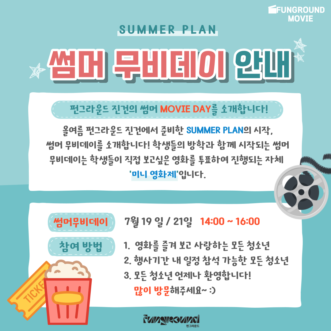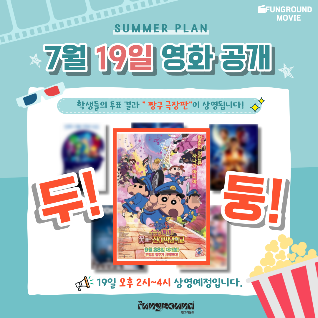 진건 [펀그라운드 진건] 썸머 무비데이 안내 작성자 펀그라운드진건 등록일자 2023년 7월 14일 13시 29분 10초 조회 367 펀그라운드 진건올 여름방학맞이 SUMMER PLAN의 시작, 썸머무비데이 일정을 안내드립니다!펀그라운드 진건에서 진행된 학생들의 현장 투표로 보고싶은 영화 TOP2를 공개합니다.- 7.19.(수) 14:00 ~ 16:00 극장판 짱구는 못말려- 7.21.(금) 14:00 ~ 16:00 원더*상기 일정은 변동될 수 있습니다. 001.png [ Size : 234.93KB, Down : 140 ] 미리보기 다운로드 002.png [ Size : 438.75KB, Down : 134 ] 미리보기 다운로드 003.png [ Size : 574.62KB, Down : 129 ] 미리보기 다운로드 004.png [ Size : 501.81KB, Down : 141 ] 미리보기 다운로드 005.png [ Size : 258.99KB, Down : 131 ] 미리보기 다운로드 006.png [ Size : 90.35KB, Down : 122 ] 미리보기 다운로드 목록보기