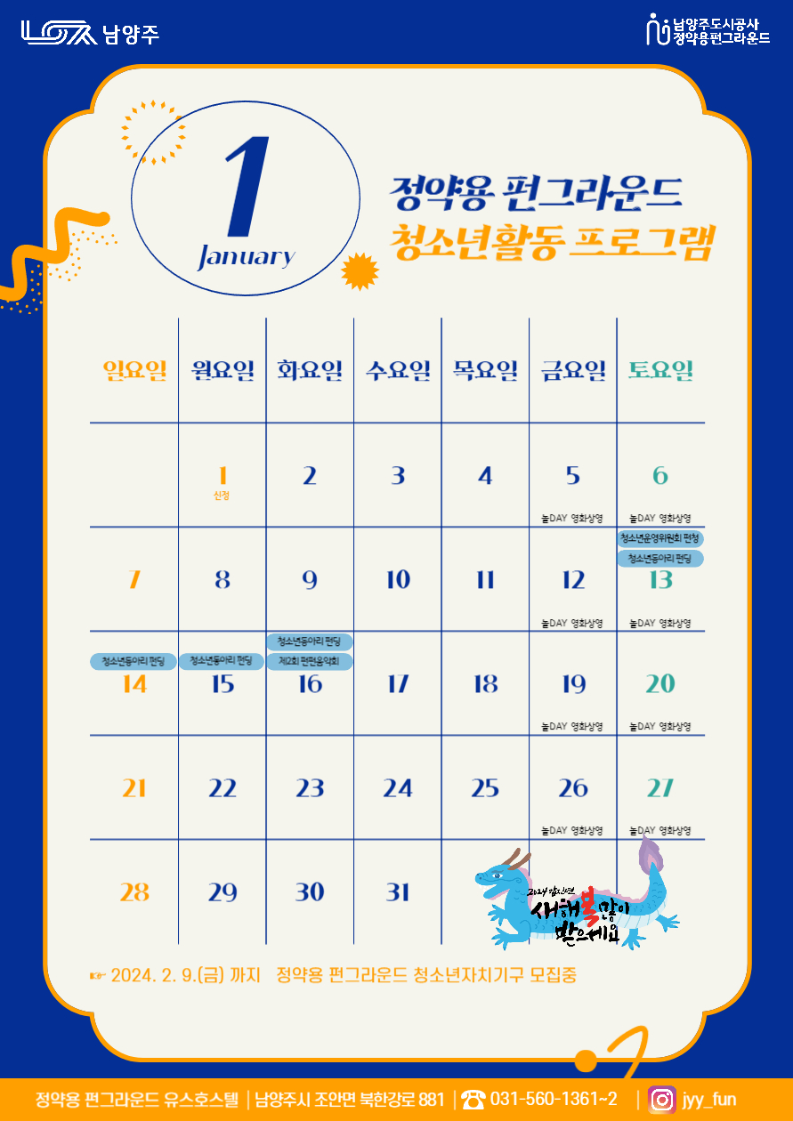 정약용 [공지] 2024년 1월 정약용 펀그라운드 청소년활동 프로그램 안내 작성자 펀그라운드정약용 등록일자 2024년 1월 2일 17시 20분 36초 조회 307 웹포스터_월간-일정-안내-001 (1).jpg [ Size : 480.27KB, Down : 194 ] 미리보기 다운로드 목록보기