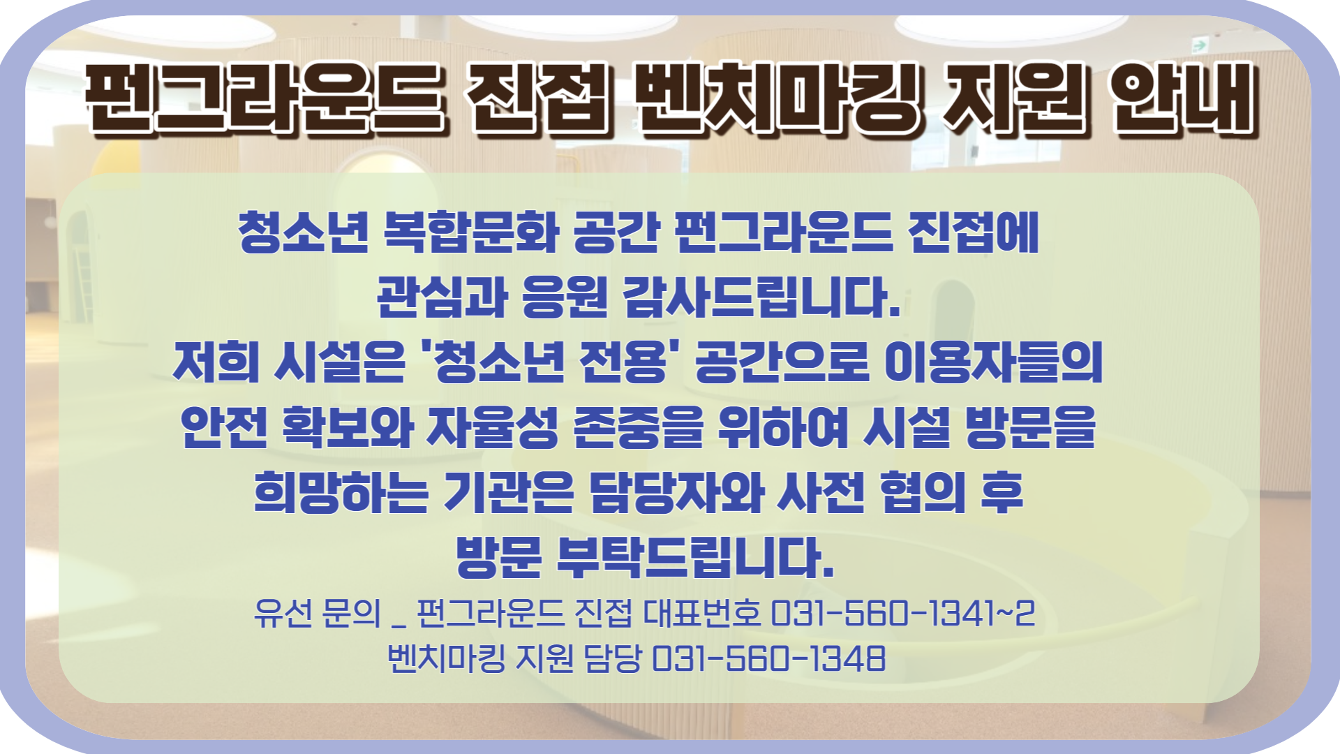 진접 [벤치마킹] 시설 벤치마킹 지원 및 방문 관련 안내 작성자 펀그라운드진접 등록일자 2023년 10월 4일 11시 18분 20초 조회 406 [펀그라운드 진접 벤치마킹 지원 안내] 청소년 복합문화 공간 펀그라운드 진접에 관심과 응원 감사드립니다. 저희 시설은 '청소년 전용' 공간으로 이용자들의 안전확보와 자율성 존중을 위하여 시설 방문을 희망하는 기관은 담당자와 사전 협의 후 방문 부탁드립니다. 유선문의 1) 펀그라운드 진접 대표번호 031-560-1341~2 2) 벤치마킹 지원 담당자 031-560-1348 벤치마킹 안내10.4..png [ Size : 1.31MB, Down : 164 ] 미리보기 다운로드 목록보기