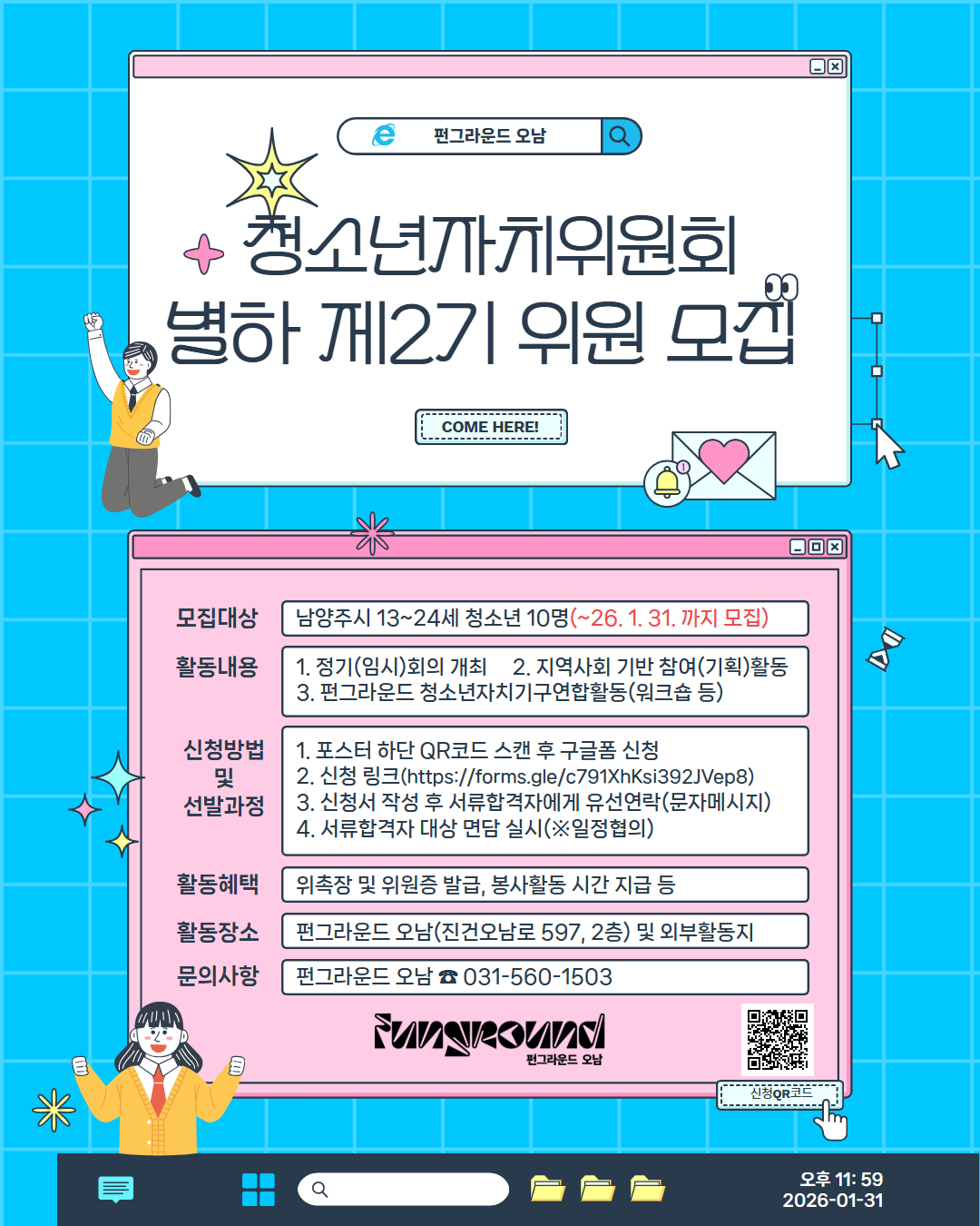 공지 오남 [펀그라운드 오남] 제2기 청소년자치위원회 모집 안내 작성자 펀그라운드오남 등록일자 2025년 12월 2일 19시 56분 16초 조회 36 모집링크: https://forms.gle/c791XhKsi392JVep8 펀그라운드 오남 청소년자치위원회 모집_1202.png [ Size : 184.12KB, Down : 31 ] 미리보기 다운로드 목록보기