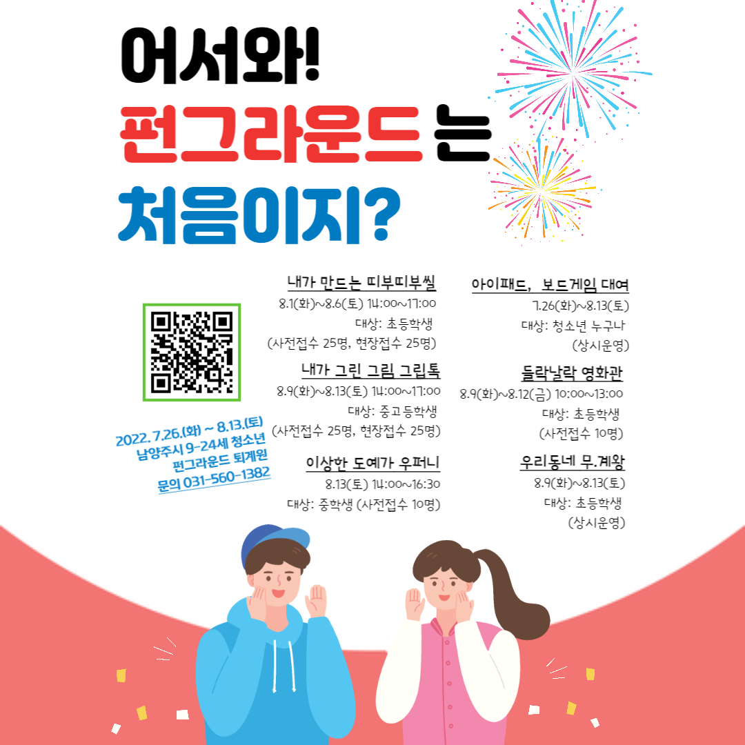 퇴계원 어서와! 펀그라운드는 처음이지? 하계방학프로그램 안내 <우리의 summer는 상상이상!> 작성자 펀그라운드 퇴계원 등록일자 2022년 9월 7일 14시 45분 18초 조회 422 QR코드로 프로그램 사전 접수하고 펀그라운드 진접 하계 여름 방학 프로그램 '우리의 SUMMER의 상상이상' 행사에 모두 모두 놀러오세요~ iuuy.jpg [ Size : 449.48KB, Down : 221 ] 미리보기 다운로드 목록보기