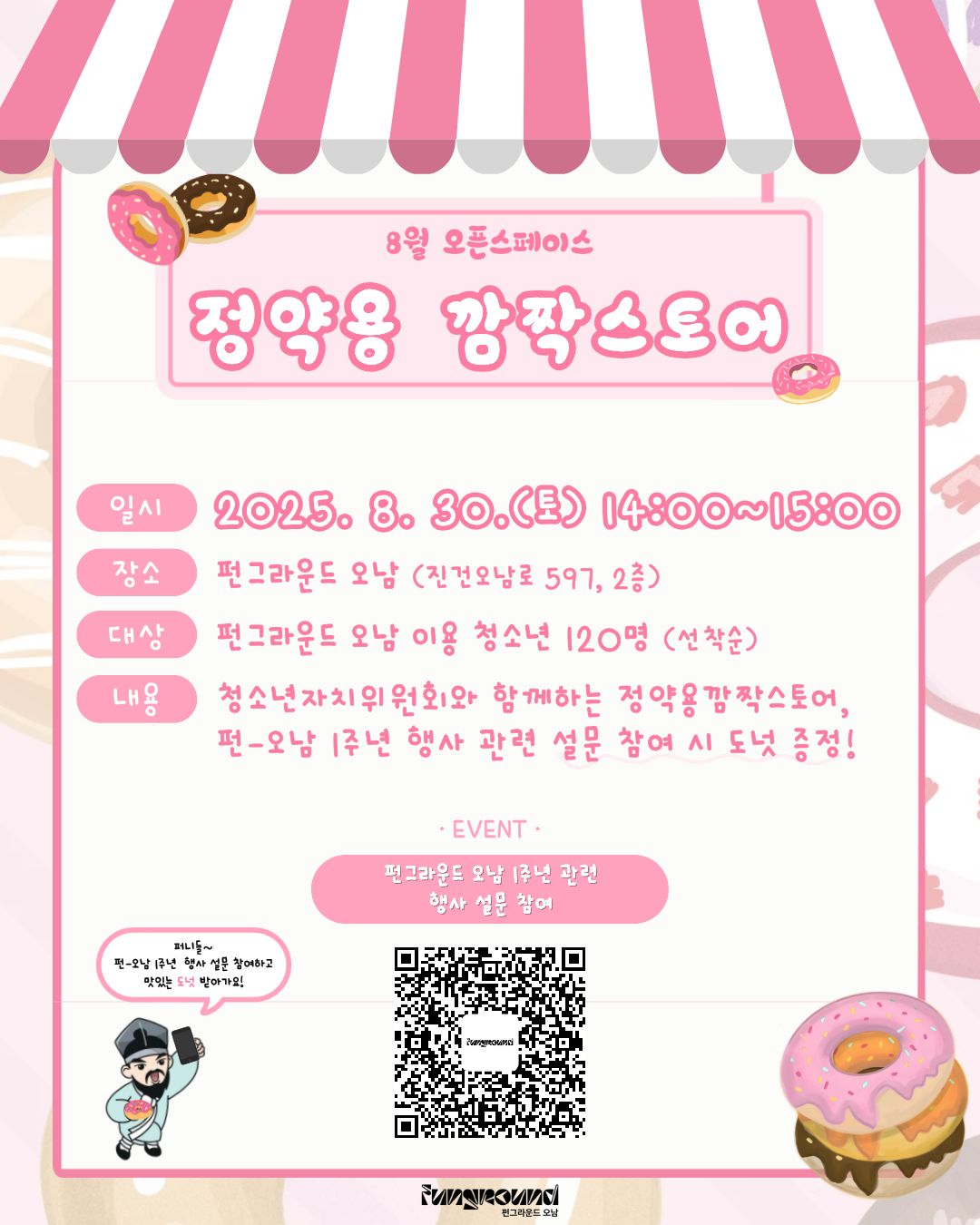 오남 [펀그라운드 오남] 8월 오픈스페이스 정약용 깜짝스토어 오픈 예정 안내 작성자 펀그라운드오남 등록일자 2025년 8월 27일 13시 30분 10초 조회 147 펀그라운드 오남 정약용 깜짝스토어 오픈 예정!!펀그라운드 오남 1주년 행사 관련 설문 참여하고 달콤한 도넛 받아가세요~ 8.30깜짝스토어.jpg [ Size : 152.9KB, Down : 45 ] 미리보기 다운로드 목록보기