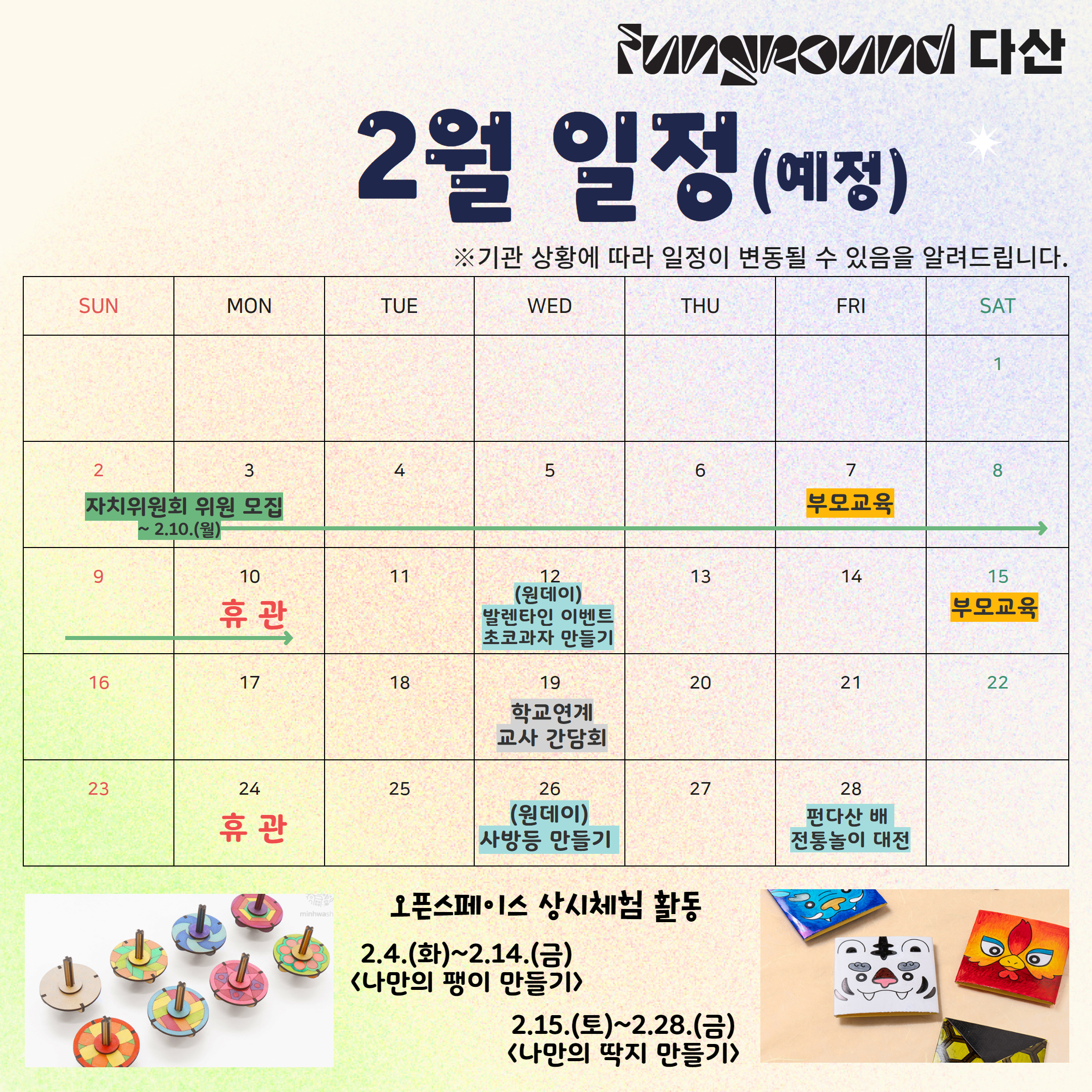 다산 [펀그라운드 다산] 2월 일정 안내 작성자 펀그라운드다산 등록일자 2025년 2월 5일 17시 0분 29초 조회 389 제목을 입력하세요 (6).jpg [ Size : 5.55MB, Down : 403 ] 미리보기 다운로드 목록보기