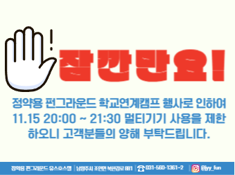 정약용 11.15 19:00 ~ 21:30 멀티기기 이용제한 안내 작성자 펀그라운드정약용 등록일자 2024년 11월 15일 9시 25분 25초 조회 290 정약용 펀그라운드 학교연계캠프 행사로 인하여 11.15 19:00 ~ 21:30 멀티기기 이용을 제한하오니 고객님의 양해 부탁드립니다. 오락기기 사용제한 안내.png [ Size : 35.85KB, Down : 142 ] 미리보기 다운로드 목록보기