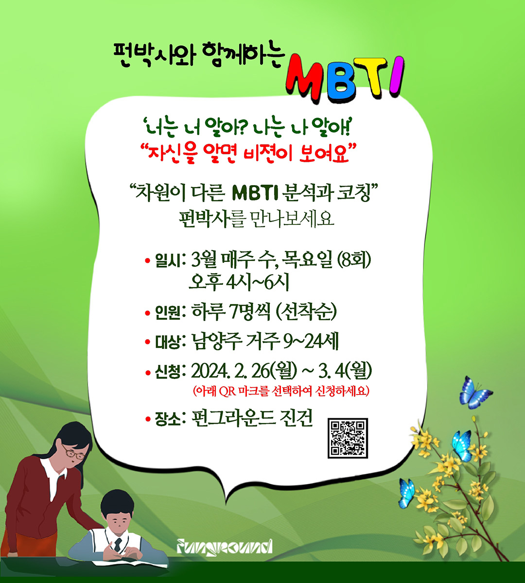 진건 (펀그라운드 진건) 문화체험 '펀박사와 함께하는 MBTI 체험' 사전 참가자 모집 작성자 펀그라운드진건 등록일자 2024년 2월 26일 11시 49분 45초 조회 264 모집사이트 바로가기: https://m.site.naver.com/1jnSs 2024_03_mbti-1080_1.jpg [ Size : 315.88KB, Down : 102 ] 미리보기 다운로드 목록보기