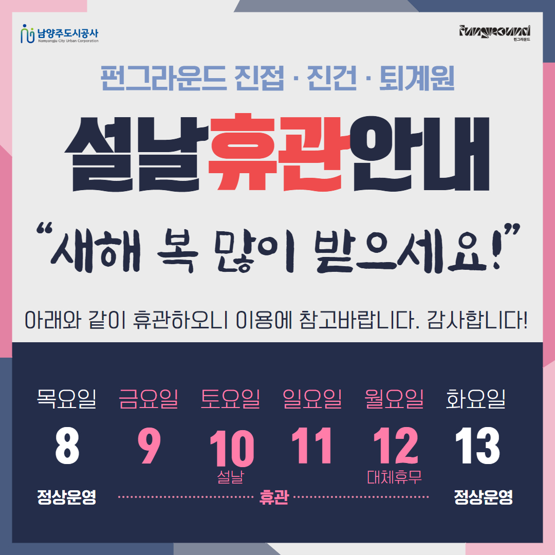 퇴계원 [공지] 2월 설날 연휴 휴관 안내 작성자 펀그라운드진접 등록일자 2024년 2월 2일 10시 50분 46초 조회 261 제목을 입력하세요 (1) (2).jpg [ Size : 404.25KB, Down : 132 ] 미리보기 다운로드 목록보기