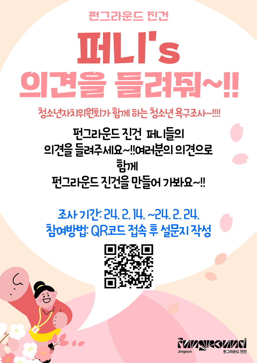 진건 진건) 퍼니's 의견을 들려줘~!!(청소년 욕구 조사 안내) 작성자 개발자 등록일자 2024년 2월 14일 18시 29분 45초 조회 308 펀그라운드 진건퍼니's 의견을 들려줘 진행 중 입니다.청소년의 의견으로 펀그라운드 진건을 만들어갑니다.다양한 의견 적어주세요~!! :) 진건) 욕구조사 최종.jpg [ Size : 208.04KB, Down : 96 ] 미리보기 다운로드 목록보기