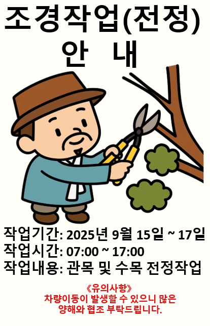 정약용 정약용 펀그라운드 조경작업(전정) 안내 작성자 펀그라운드정약용 등록일자 2025년 9월 9일 17시 34분 13초 조회 117 조경작업 안내문(팝업).jpg [ Size : 191.84KB, Down : 64 ] 미리보기 다운로드 목록보기