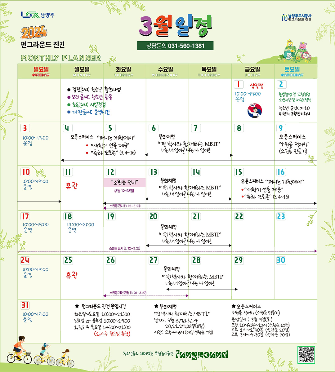 진건 [펀그라운드 진건] 3월 일정입니다 작성자 펀그라운드진건 등록일자 2024년 2월 29일 12시 23분 25초 조회 300 2024-03 일정.jpg [ Size : 401.05KB, Down : 147 ] 미리보기 다운로드 목록보기