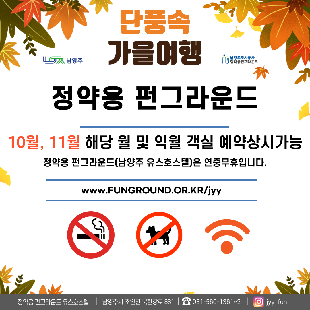 정약용 [공지] 10, 11월 정약용 펀그라운드 유스호스텔 객실 예약 안내 작성자 강정배 등록일자 2024년 10월 1일 9시 10분 35초 조회 357 10월 홈페이지.png [ Size : 348.65KB, Down : 206 ] 미리보기 다운로드 목록보기