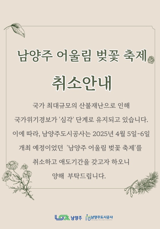 다산 남양주 어울림 벚꽃 축제 취소 안내 작성자 펀그라운드다산 등록일자 2025년 3월 31일 16시 51분 30초 조회 176 KakaoTalk_20250331_161017993.png [ Size : 73.86KB, Down : 61 ] 미리보기 다운로드 목록보기