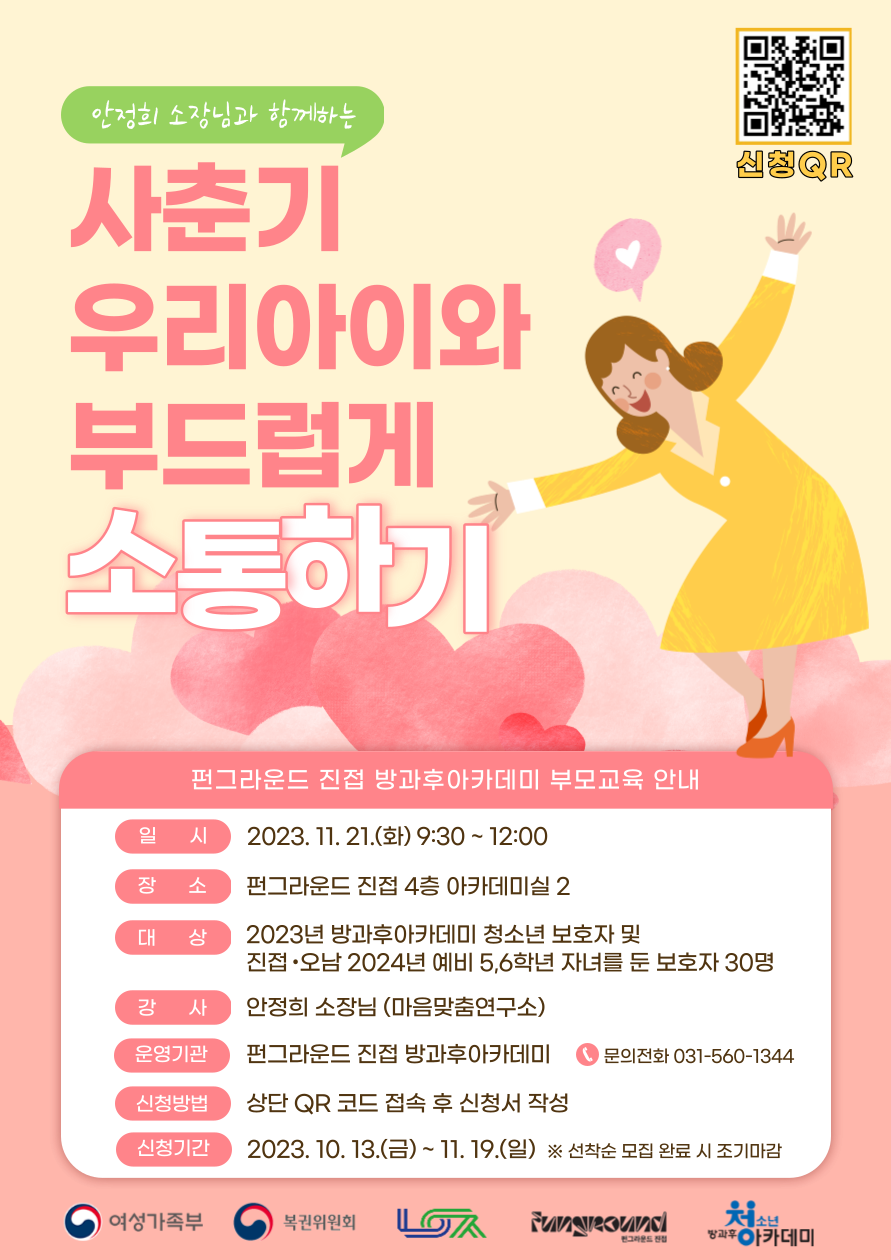 진접·오남읍의 청소년의 건강한 성장을 지원하고자 2024년 초등 5,6학년 자녀를 둔 보호자님을 대상으로 「부모교육」 프로그램을 아래와 같이 운영하오니 많은 관심과 참여 부탁드립니다. :)