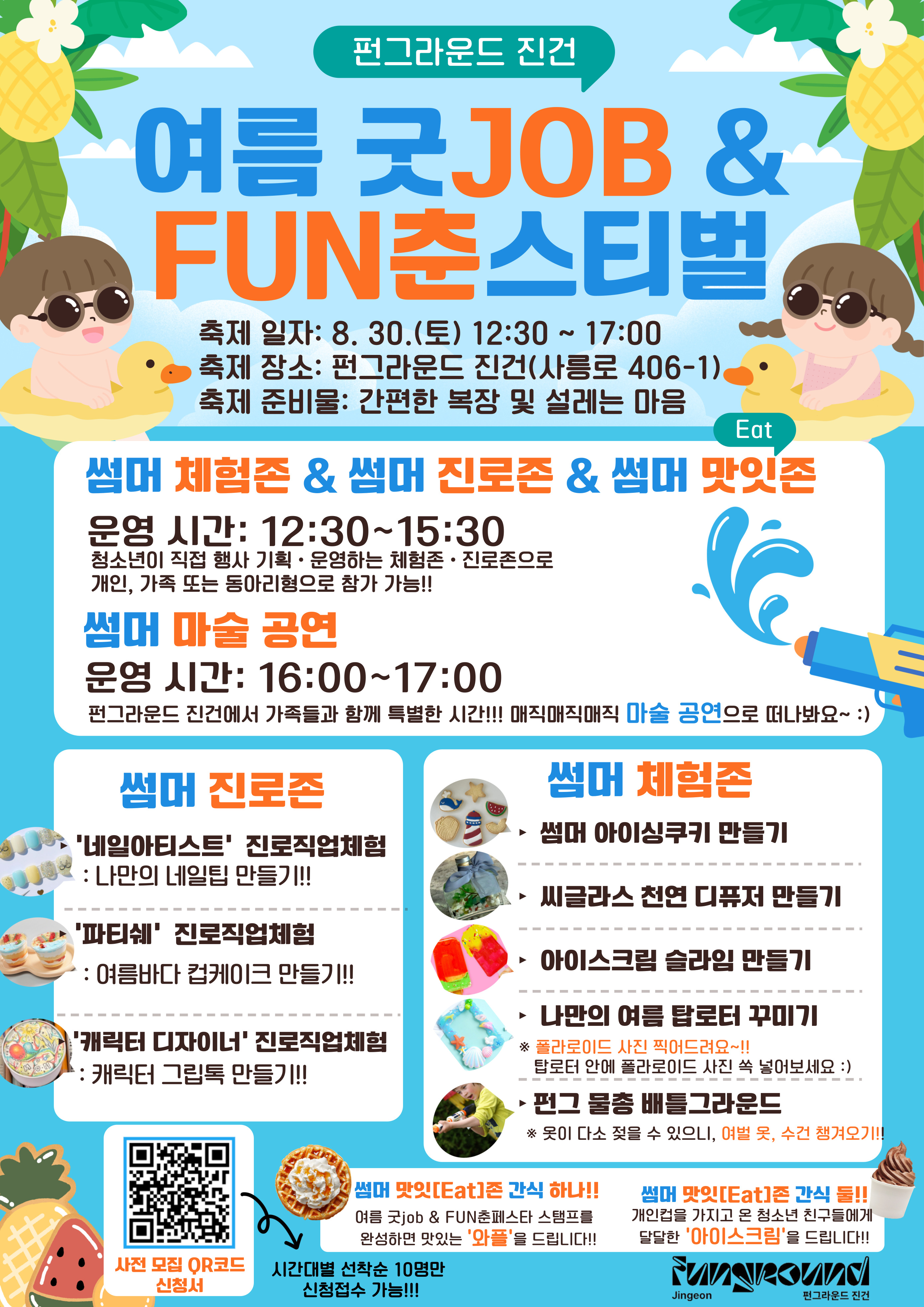 진건 [펀그라운드 진건] 8월 유스페스타 "여름 굿JOB & FUN춘페스티벌 운영 사전 모집 작성자 펀그라운드진건 등록일자 2025년 8월 5일 18시 1분 42초 조회 163 유스페스타 홍보지(최종).jpg [ Size : 1.86MB, Down : 60 ] 미리보기 다운로드 목록보기