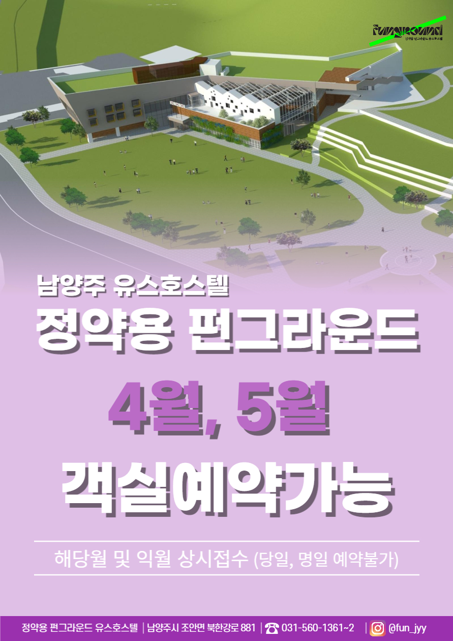 정약용 [예약] 4월, 5월 정약용 펀그라운드 유스호스텔 객실 예약 가능 안내 작성자 펀그라운드정약용 등록일자 2023년 4월 1일 16시 27분 44초 조회 538 웹포스터_공지사항-002.jpg [ Size : 622.83KB, Down : 380 ] 미리보기 다운로드 목록보기