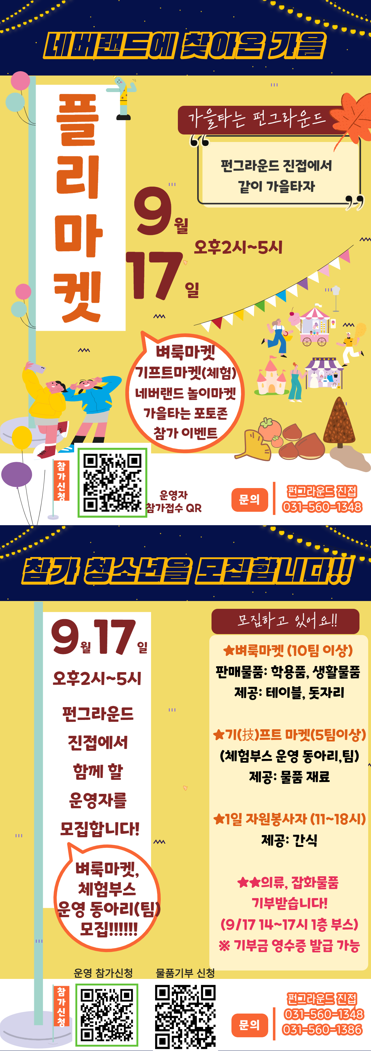 진접 9월17일 플리마켓 행사 운영자 모집합니다!!(벼룩마켓 운영자) 작성자 펀그라운드진접 등록일자 2022년 9월 15일 15시 30분 22초 조회 500 9월17일 토요일 오후2~5시 펀그라운드 진접에서 '플리마켓'을 개최합니다! [모집하고있어요!] ※ 봉사시간 발급 1. 벼룩마켓(중고물품 판매) 신청바로가기 링크 -> https://naver.me/x7rplwaB[9월17일 펀그라운드에 오면?] ★ 벼룩마켓, 페이스페인팅 등 체험부스 진행! ★ 네버랜드 놀이마켓으로 다양한 놀이체험 참여! ★ 입장만 해도 선물이 주어지는 추첨 이벤트 진행! ※ 9월17일 펀그라운드 1층에서 지역주민들의 의류, 잡화 등 중고물품을 기부 받고 있습니다.('기부금 영수증' 발급) [문의] 펀그라운드 진접 031-560-1348 포스터 한장.png [ Size : 600.41KB, Down : 177 ] 미리보기 다운로드 목록보기