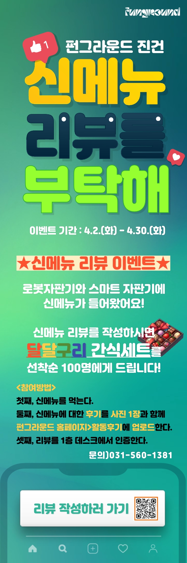 진건 오픈스페이스 '신메뉴 리뷰를 부탁해' 작성자 개발자 등록일자 2024년 3월 22일 17시 36분 44초 조회 330 안녕하세요.펀그라운드 진건입니다. 청소년 욕구조사 의견을 토대로청소년이 원하는 간식 및 음료 등 신메뉴로 들어왔어요~!!짝짝짝 :)4월 2일 ~ 4월 30일"신메뉴 리뷰 부탁해"이벤트 진행합니다. 많은 관심과 참여부탁합니다. 참여방법하나, 신메뉴를 먹는다둘, 사진과 함께 후기를 활동후기를 업로드한다.셋, 리뷰를 1층 인증한다.선착순 100명 달달구리 간식 제공 진건) 신메뉴 이벤트 (1).jpg [ Size : 520.47KB, Down : 124 ] 미리보기 다운로드 제목을-입력해주세요__복사본-001.png [ Size : 383.35KB, Down : 130 ] 미리보기 다운로드 목록보기