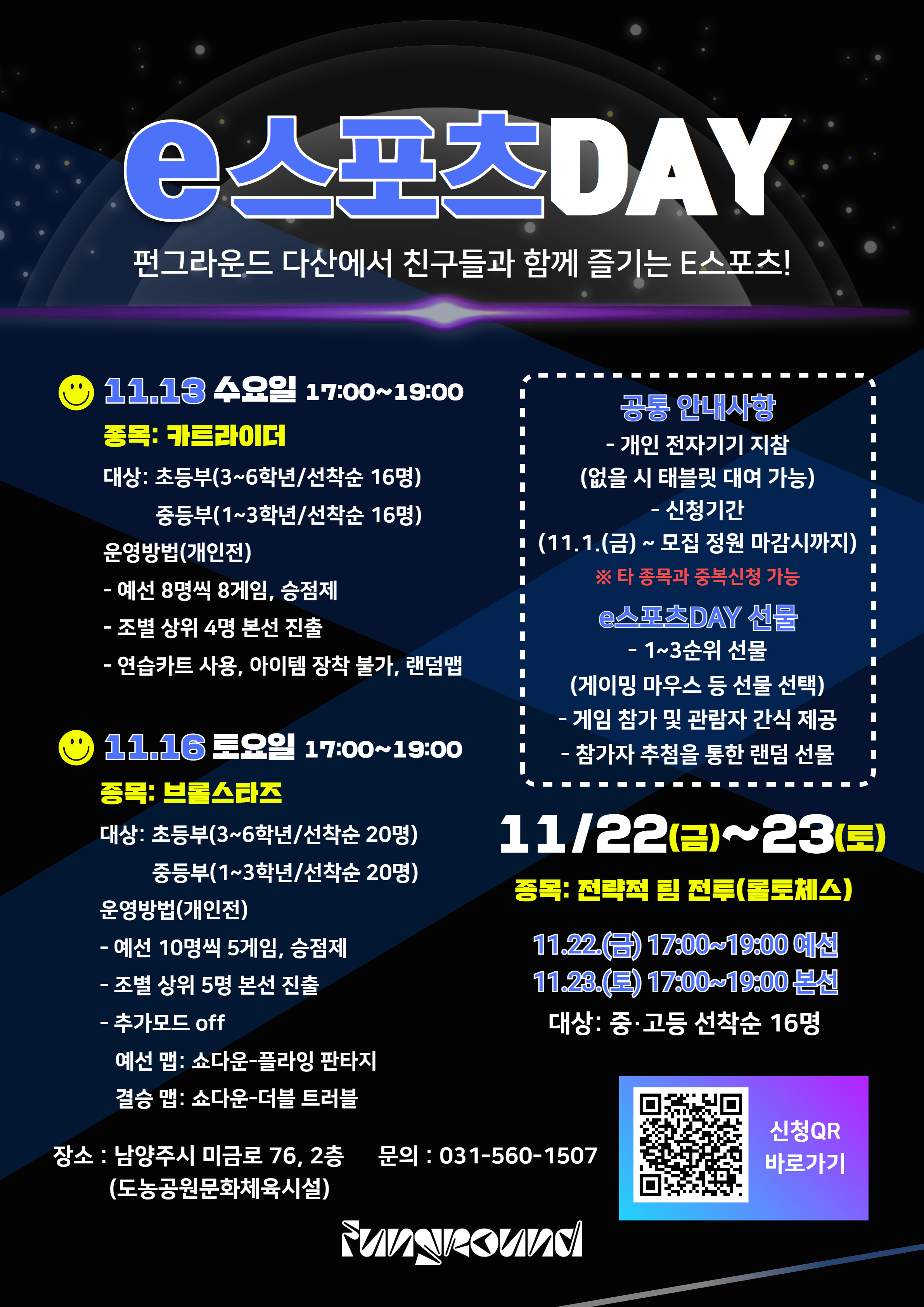 다산 [펀그라운드 다산] 11월 e스포츠DAY 안내 작성자 청소년수련관 등록일자 2024년 11월 1일 18시 25분 59초 조회 455 ※모집 정원 미달로 인한 프로그램 미운영시 개별 연락드리겠습니다. e스포츠DAY .jpg [ Size : 2.33MB, Down : 327 ] 미리보기 다운로드 목록보기