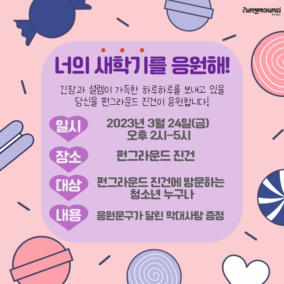 진건 [펀그라운드 진건] 너의 새학기를 응원해! 작성자 펀그라운드진건 등록일자 2023년 3월 22일 14시 35분 29초 조회 419 긴장과 설렘이 넘치는 새학기를 보내고 있을 당신을펀그라운드 진건이 응원합니다!이번주 금요일 오후 2시부터 5시까지펀그라운드 진건에 방문하는 모든 청소년에게응원문구가 달린 막대사탕을 드려요~ 많은 관심과 방문 부탁드립니다! 컨셉데이-캔디데이-001.jpg [ Size : 217.12KB, Down : 174 ] 미리보기 다운로드 목록보기