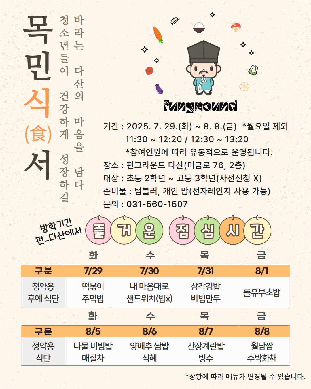 다산 [펀그라운드 다산] 방학기간 점심식사 프로그램 '목민식食서' 안내
