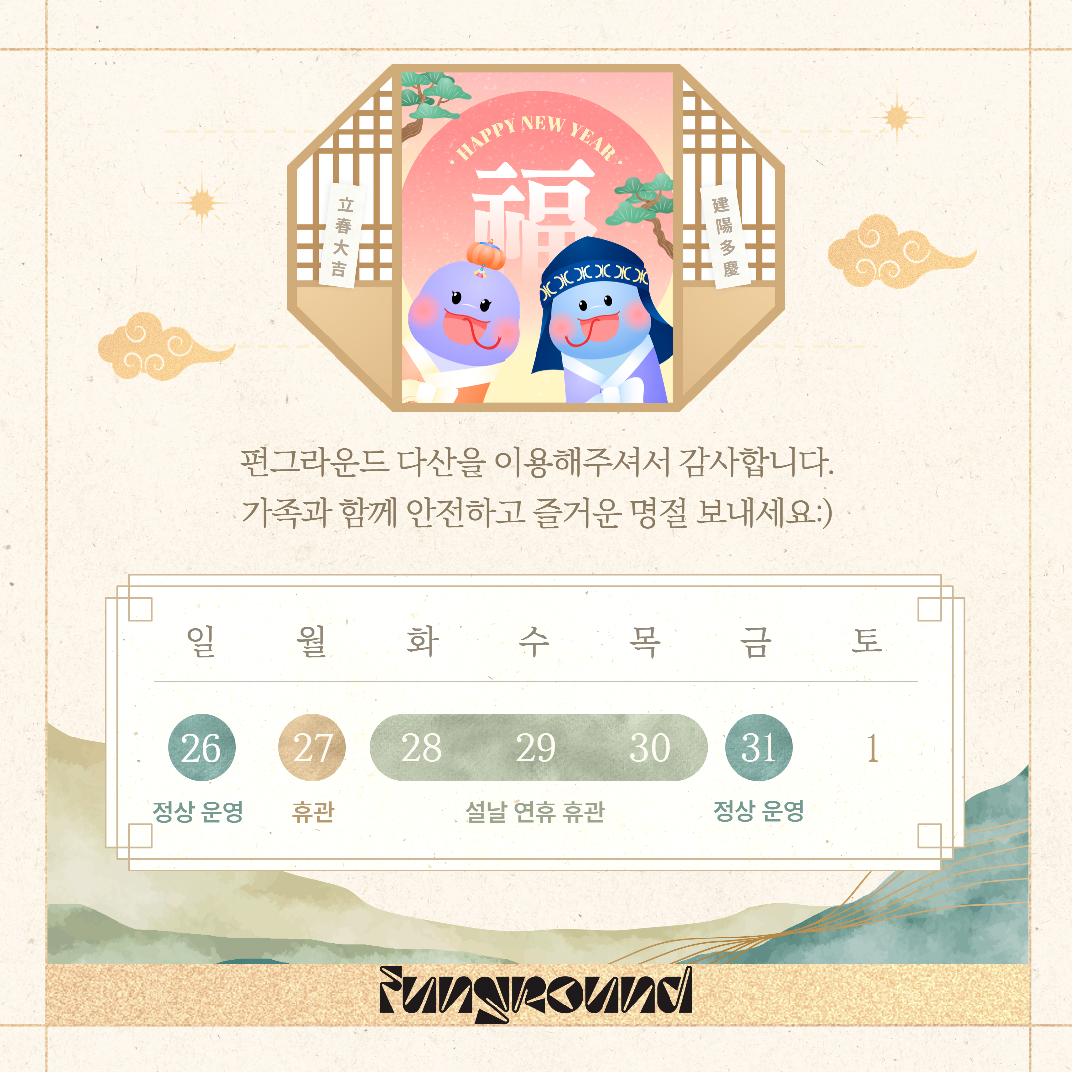 다산 2025년 펀그라운드 다산 설 연휴 휴관 안내 작성자 펀그라운드정약용 등록일자 2025년 1월 17일 15시 30분 28초 조회 311 (다산) 설날 팝업.jpg [ Size : 3.87MB, Down : 186 ] 미리보기 다운로드 목록보기